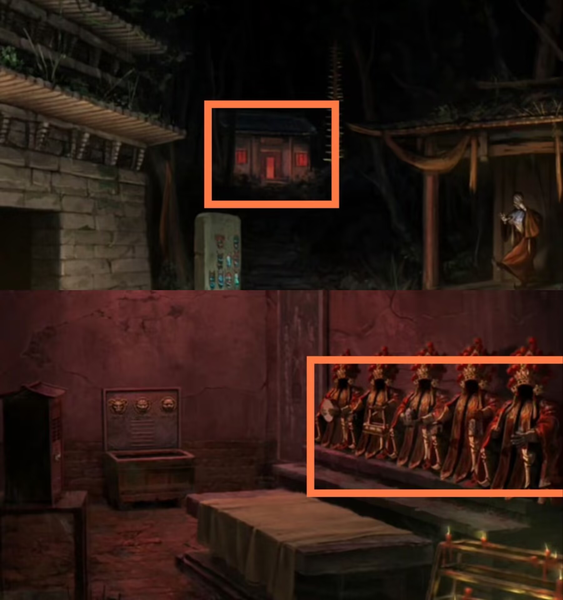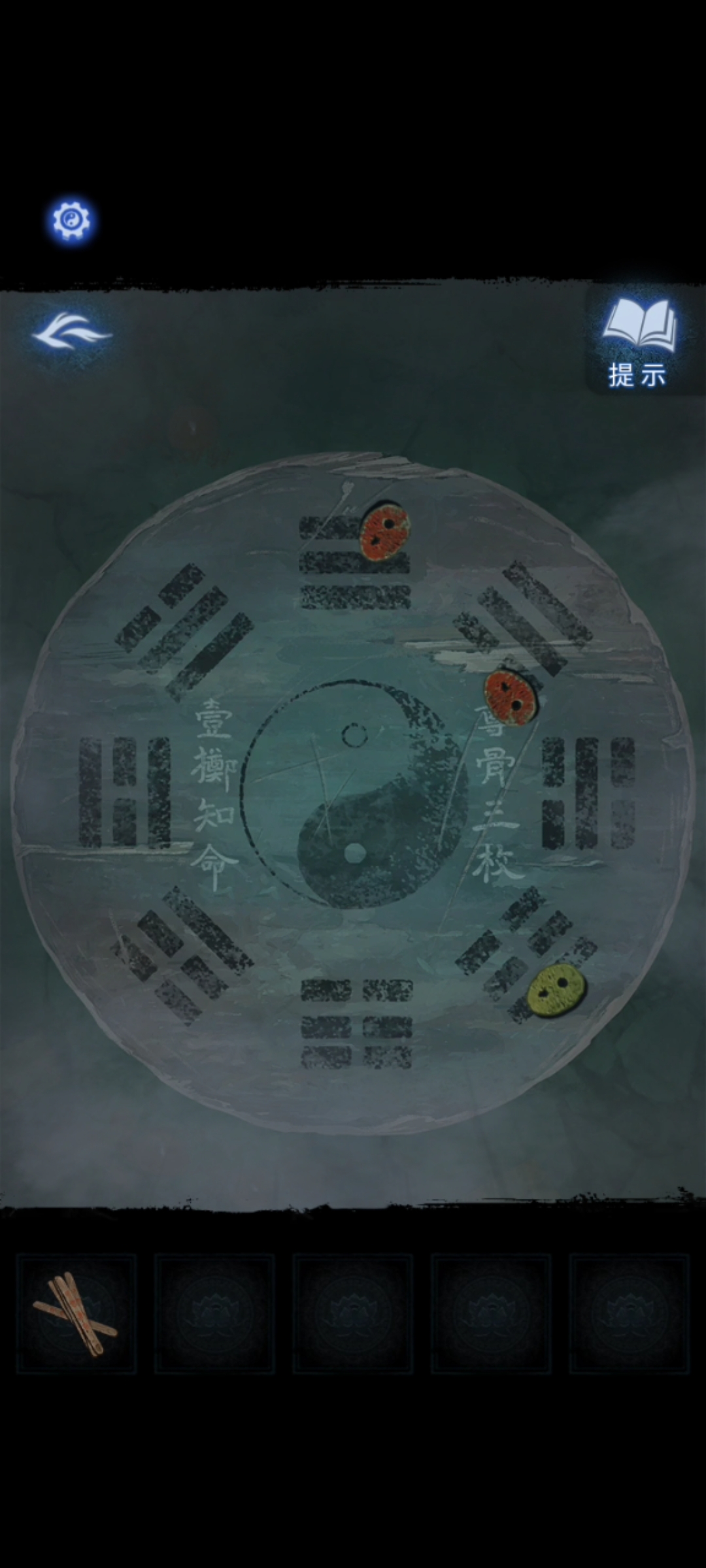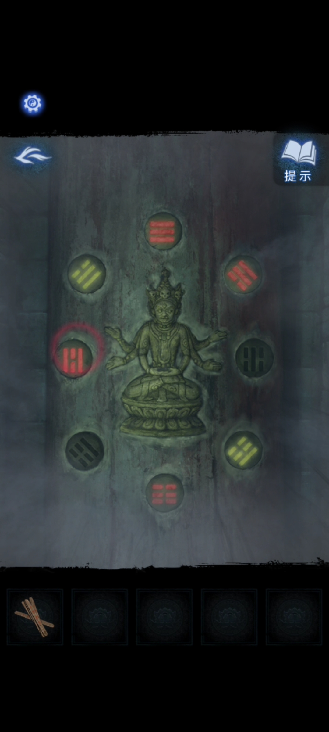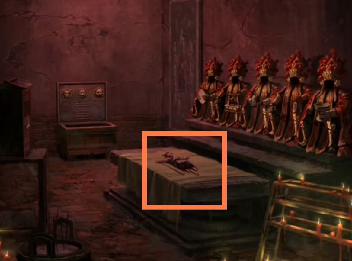 15.去称骨斋用【骨币】在左侧石桌上占卜,得到送喜阁墙上六葬菩萨八卦像的另一个提示后,回到送喜阁按照颜色点亮五个卦象,遇见最后一尊木质六葬菩萨。用【木符咒】消灭神像,得到它口中的【一串古钱】。