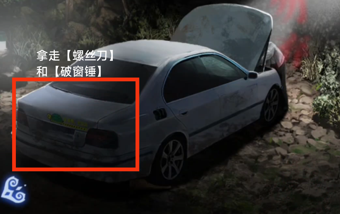 1. 点击打开车辆后备箱,拾取【螺丝刀】【安全锤】。