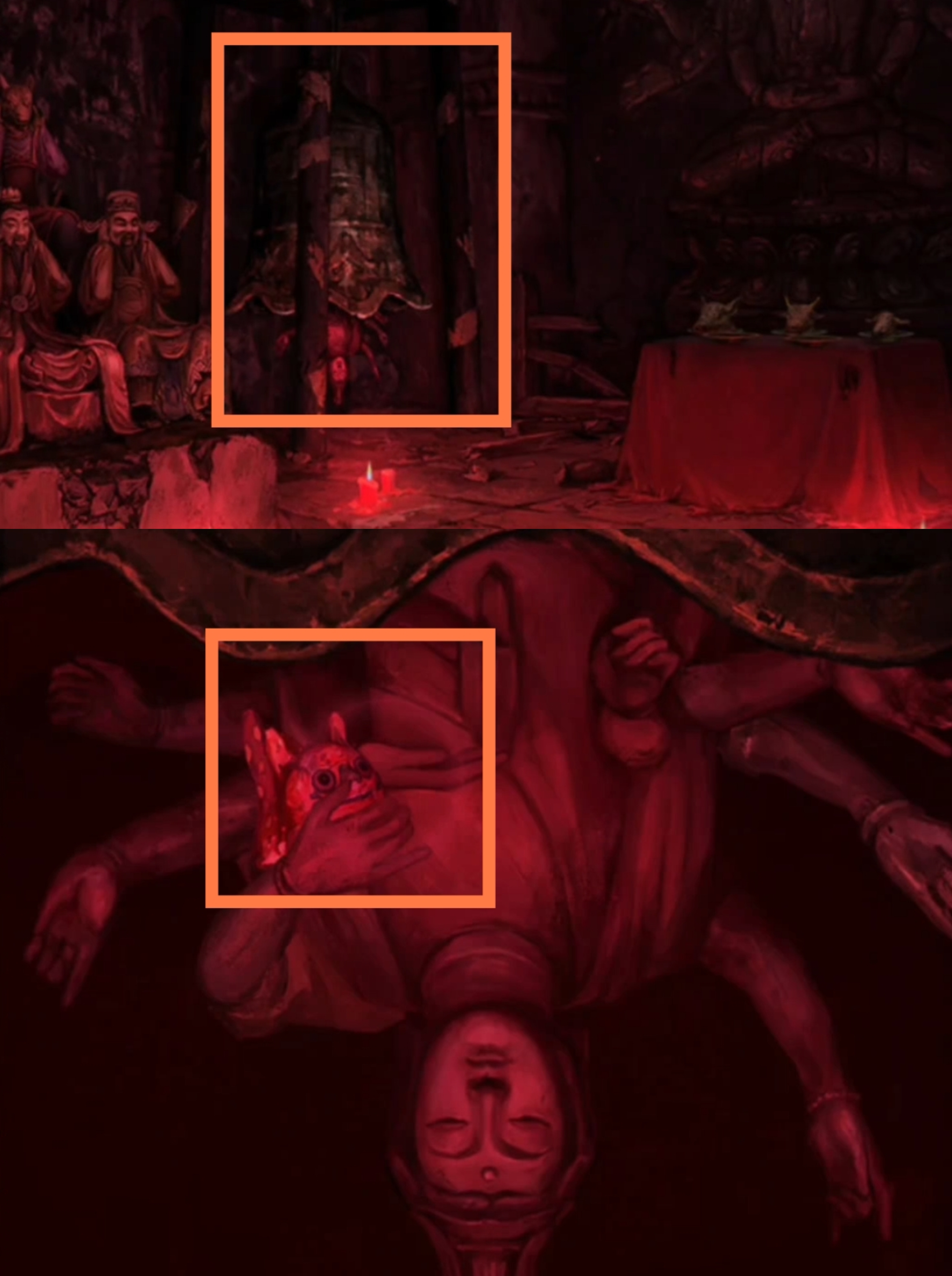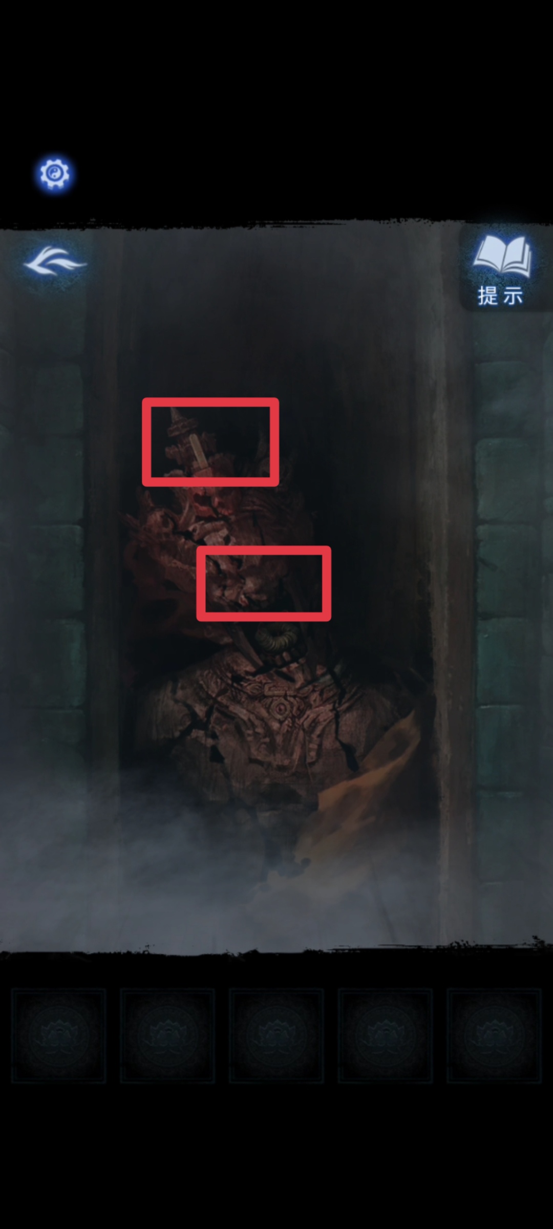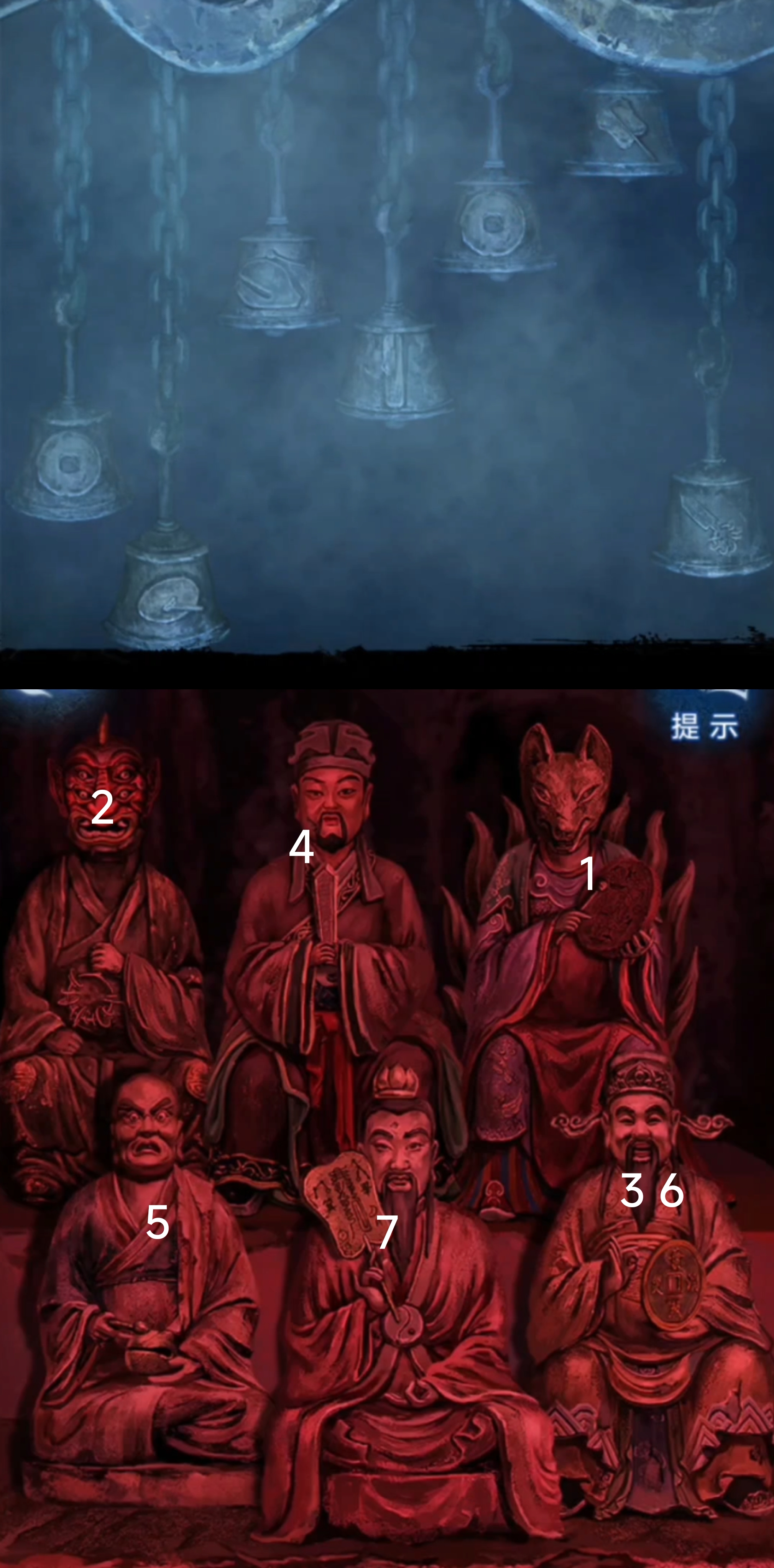 4. 切换至红色视角,从五人中获得【泥塑头像】,【酒葫芦】。进入塔内,调查右侧供桌,拾取【泥塑头像】,【泥塑头像】。调查左侧神像群,使用所有【泥塑头像】,按照服饰细节调整泥塑头像位置,上列从左到右依次调整为【四眼鬼怪,文官,狐狸】;下列从左到右依次调整为【罗汉,道士,神仙】。调查大钟,点击拾取【布老虎】。