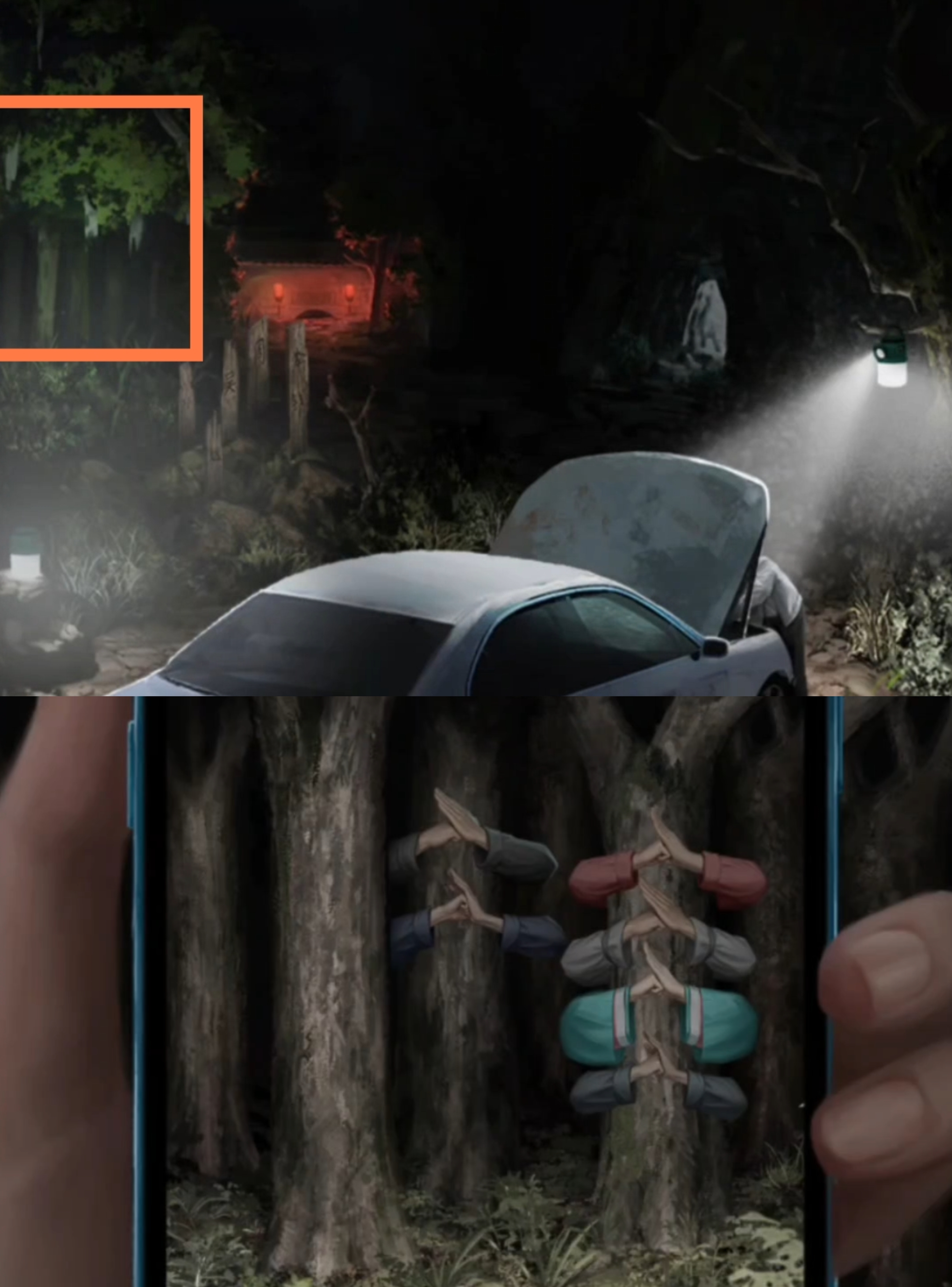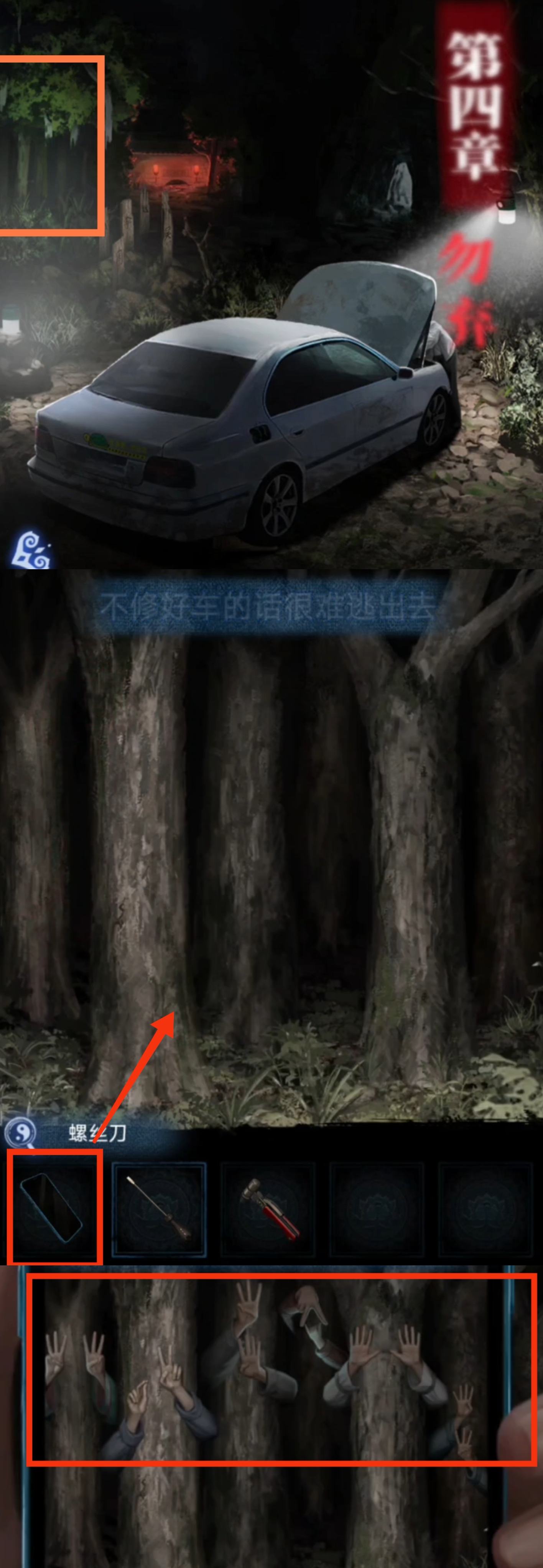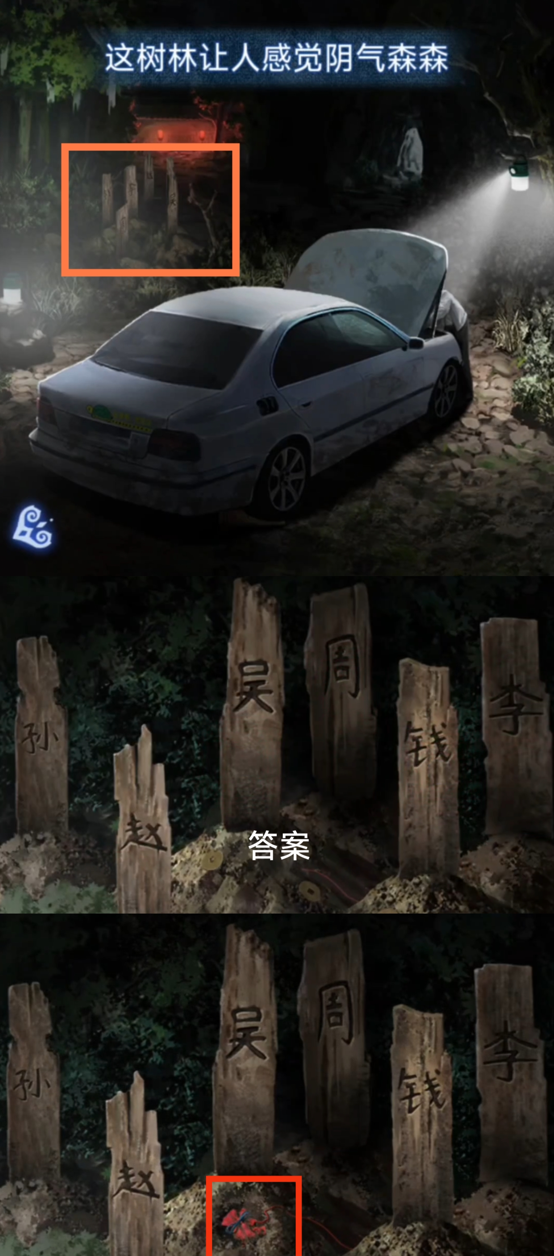 2. 点击左侧的小树林,使用【手机】,注意观察每棵树对应的两两一组的数字线索。返回车辆场景,点击右侧坟头,根据刚刚观察到的数字线索,结合墓碑上的姓氏笔画数量,调整顺序为【孙赵吴周钱李】,获得【蚕丝香囊】(如,左侧第一棵树的手势为左3右3,对应的左侧第一个坟墓的姓氏就是孙)。