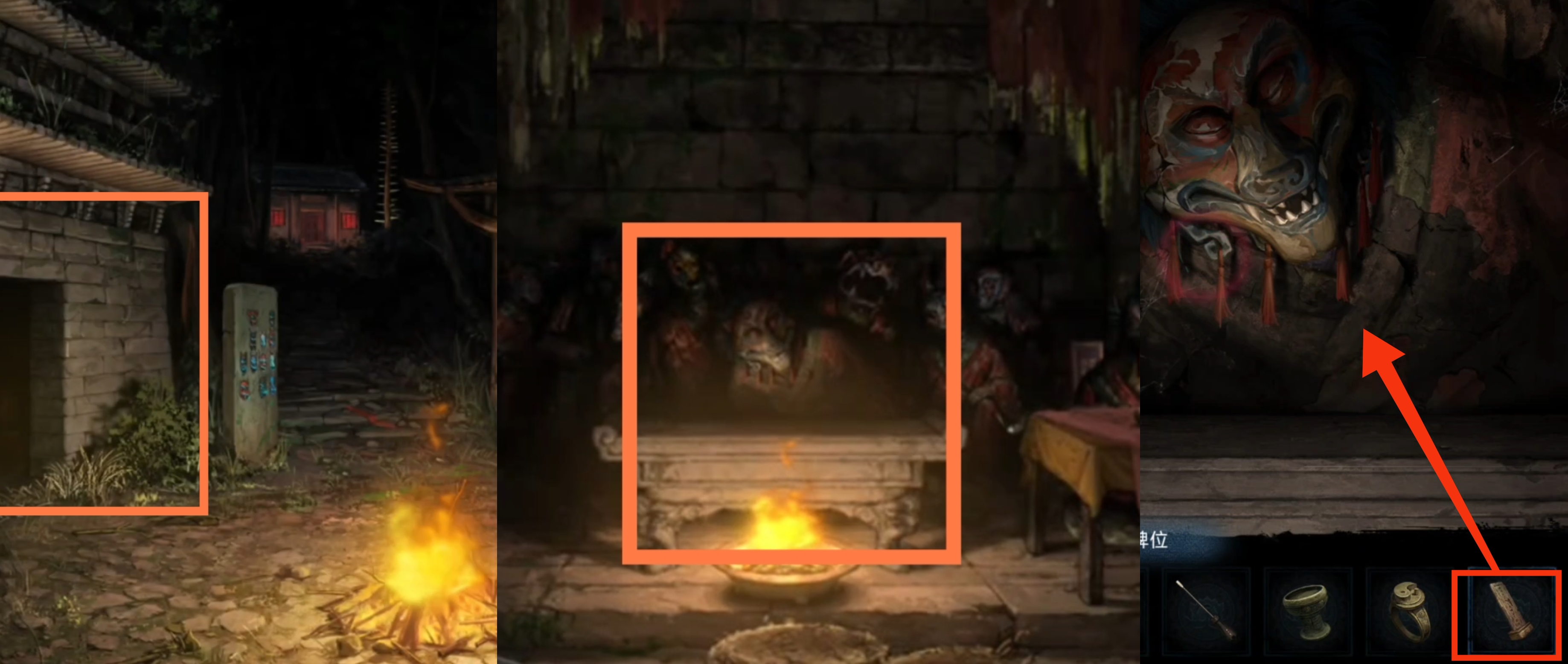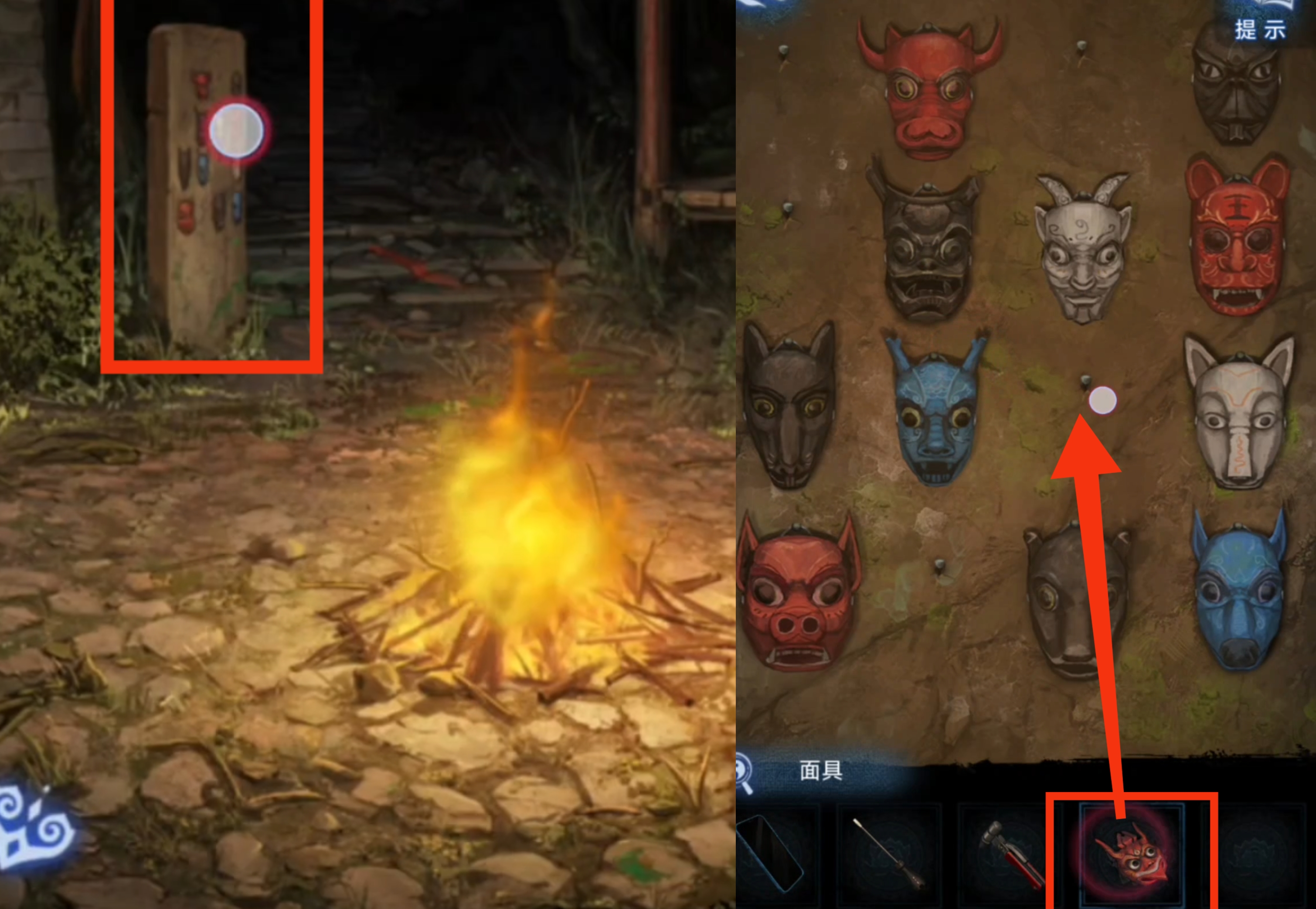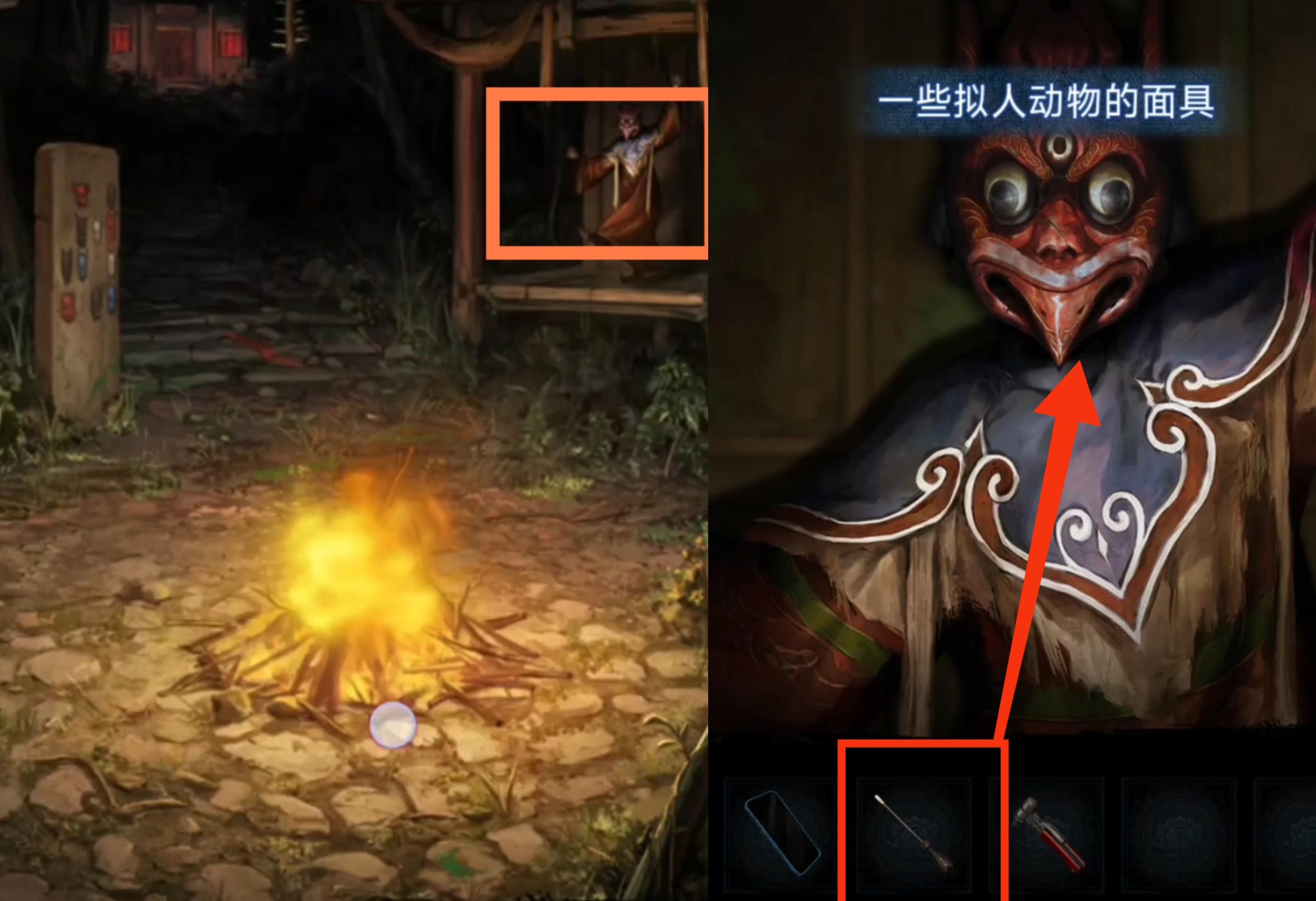 3. 进入篝火场景,调查右侧的戏台,对木偶使用螺丝刀,获得【面具】。返回后调查左侧石壁,放置【面具】,解锁九圣庙。