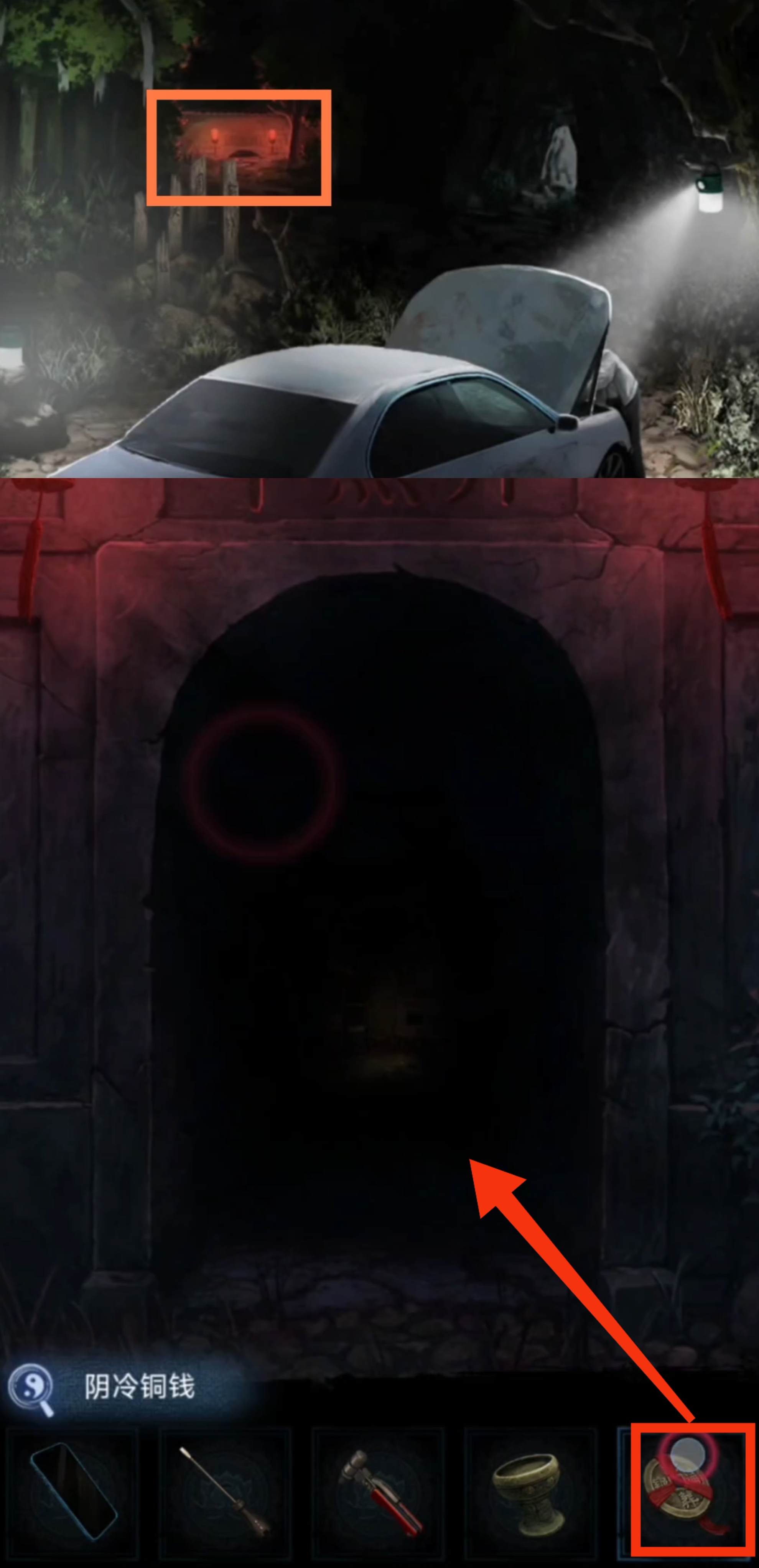 7. 进入山洞场景,给予聂莫黎【樟柳神】,剧情后获得【阴气铜钱】。返回车辆场景,进入弃煞牢门口场景,使用【阴气铜钱】,解锁弃煞牢场景。