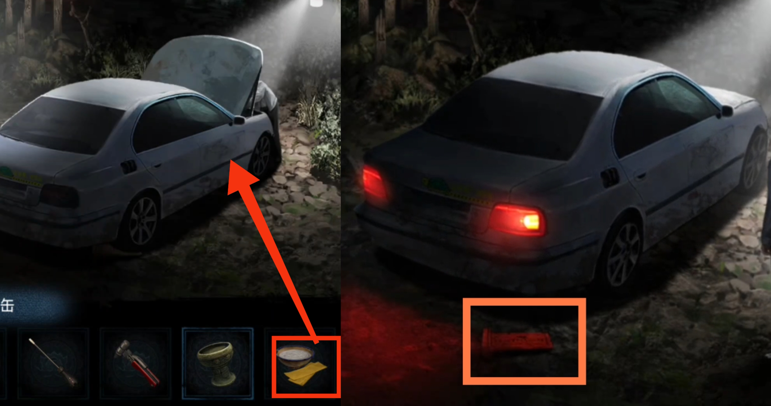 11. 返回车辆场景,给予车前的宁子服【浆糊和符纸】,进入检修小游戏,结束后再车辆后方,拾取【牌位】。