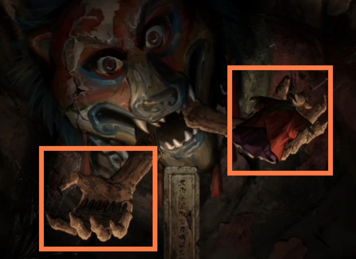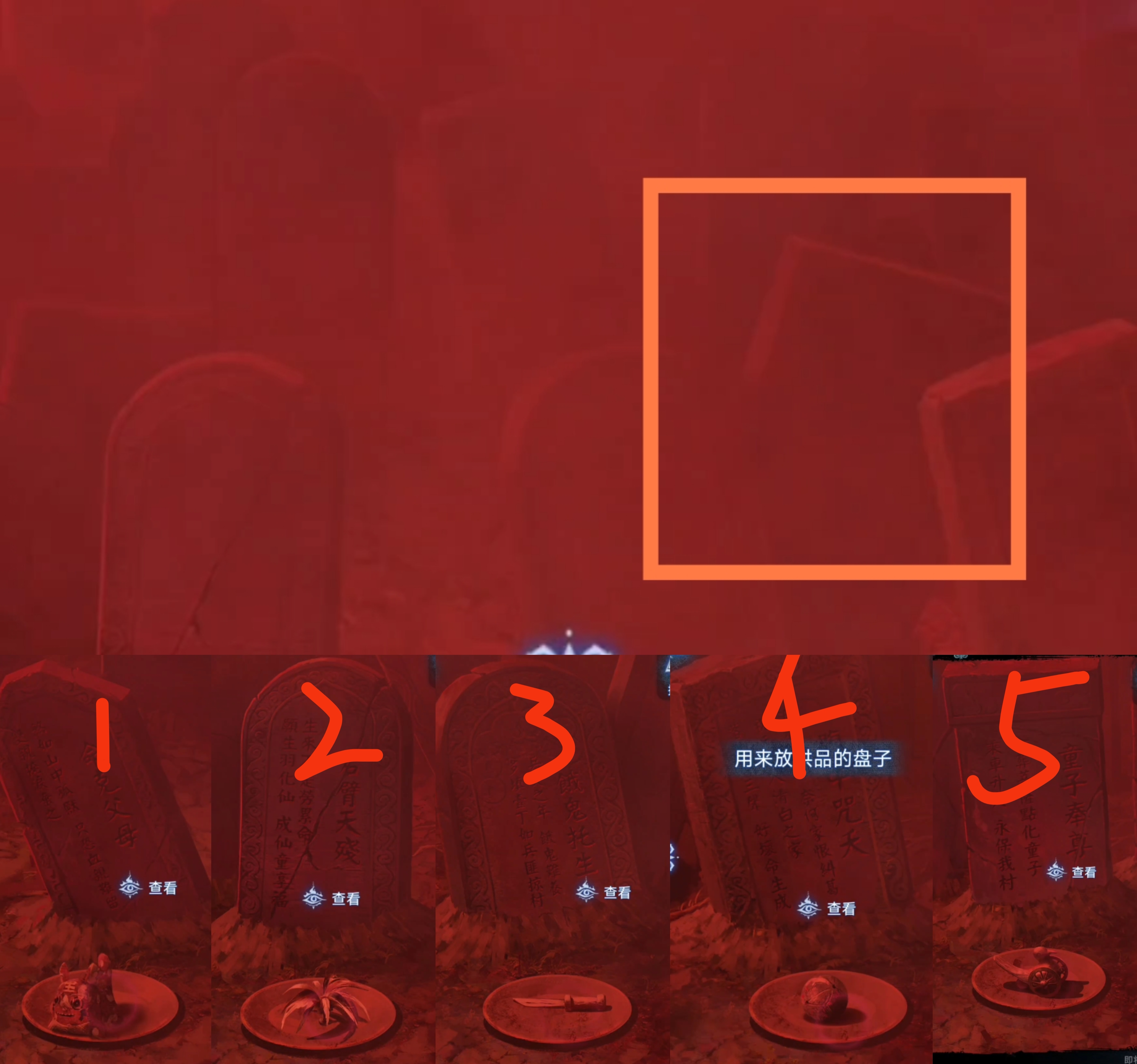 2. 切换至莫黎视角(为方便区分,以下统称为蓝色视角),进入六葬菩萨场景,按照上一步骤中观察到的祭品类型,将五人手中的祭品从左往右调整为【牲头,葫芦,果子,香炉,泥塑人头】。拾取【一束花】。