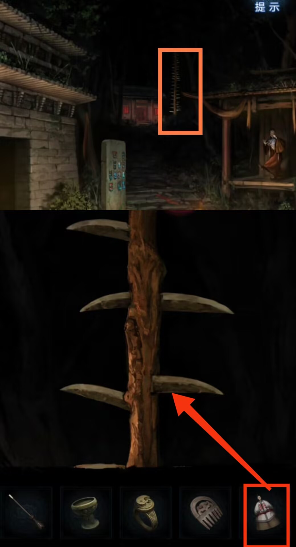 3. 返回大树场景,调查神龛,对铜钱使用【一束花】。拾取【古怪树枝】。回到六葬菩萨场景,调查右侧塔,对塔门使用【古怪树枝】,解锁塔内。