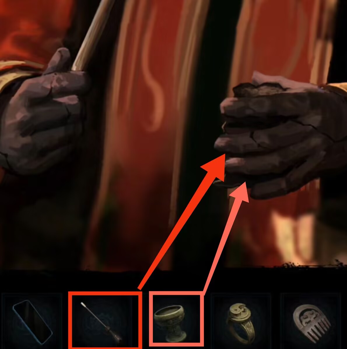 22. 进入山顶破庙场景,调查左侧香炉,根据上一步骤中观察到的蟋蟀断腿线索,点击调整香的颜色。获得【骨头饰品】。