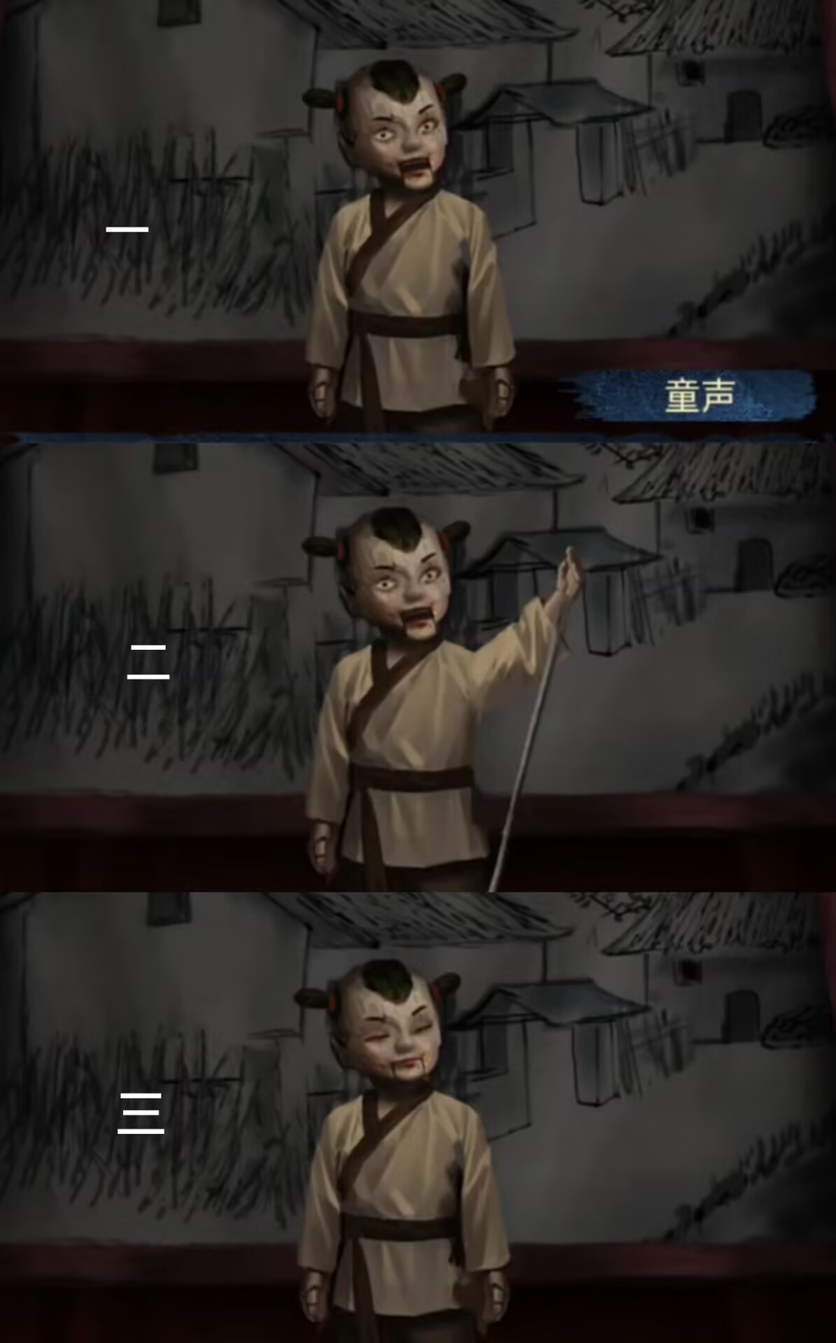 16. 进入弃煞牢,调查左侧木偶台子,使用【杖头木偶】。根据歌谣调整木偶,第一阶段为睁眼张嘴,双臂下垂。第二阶段为睁眼张嘴,右臂下垂,左臂上扬。第三阶段为闭眼闭嘴,双臂下垂。结束后拾取【小木锤】,【小铜棒】,【万字戒指】。