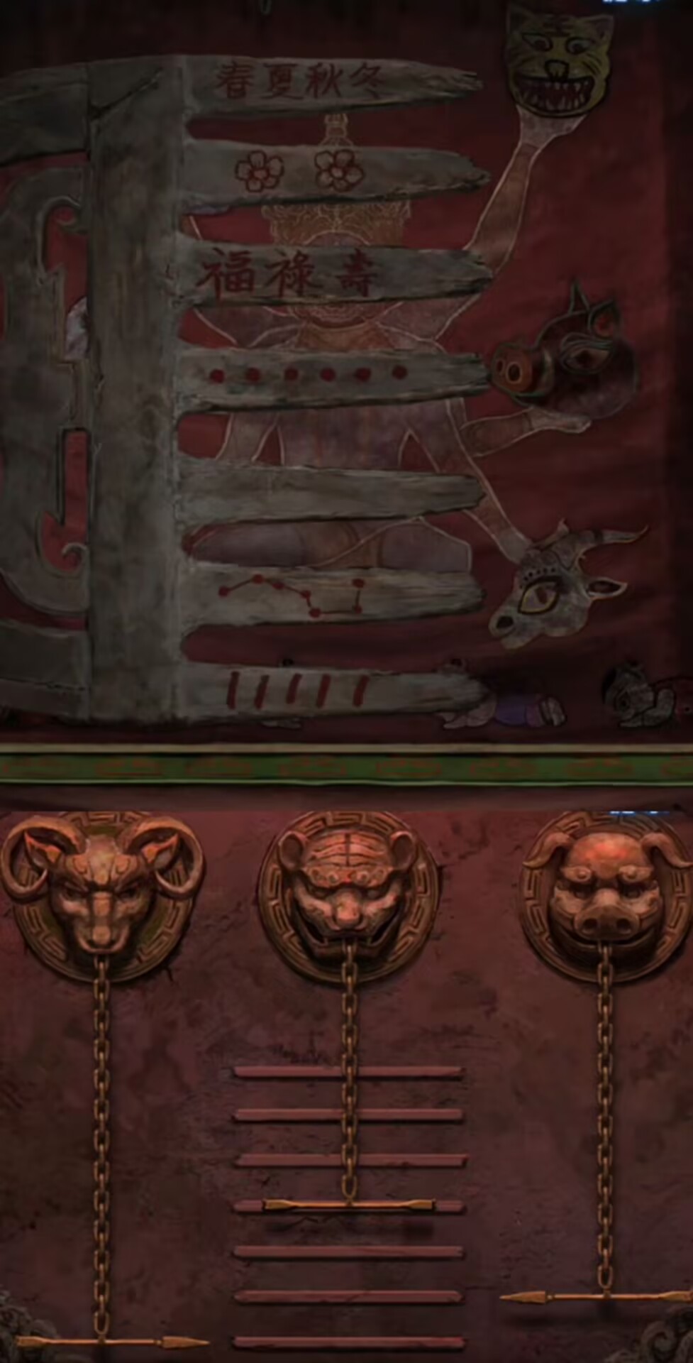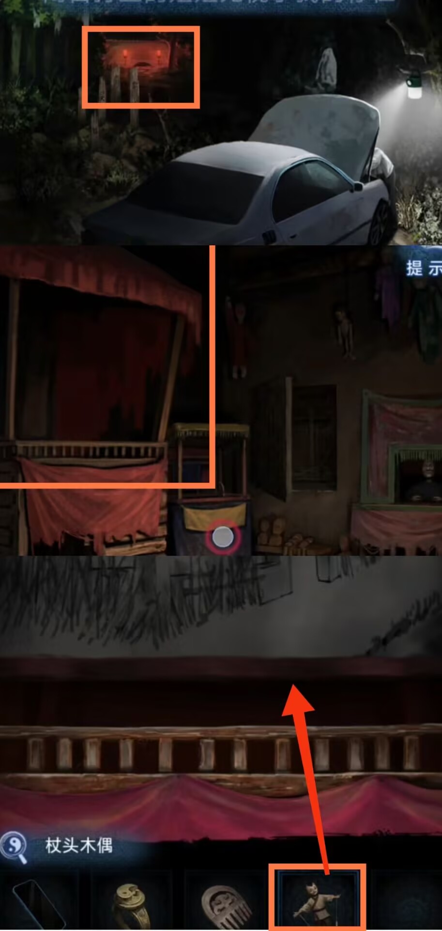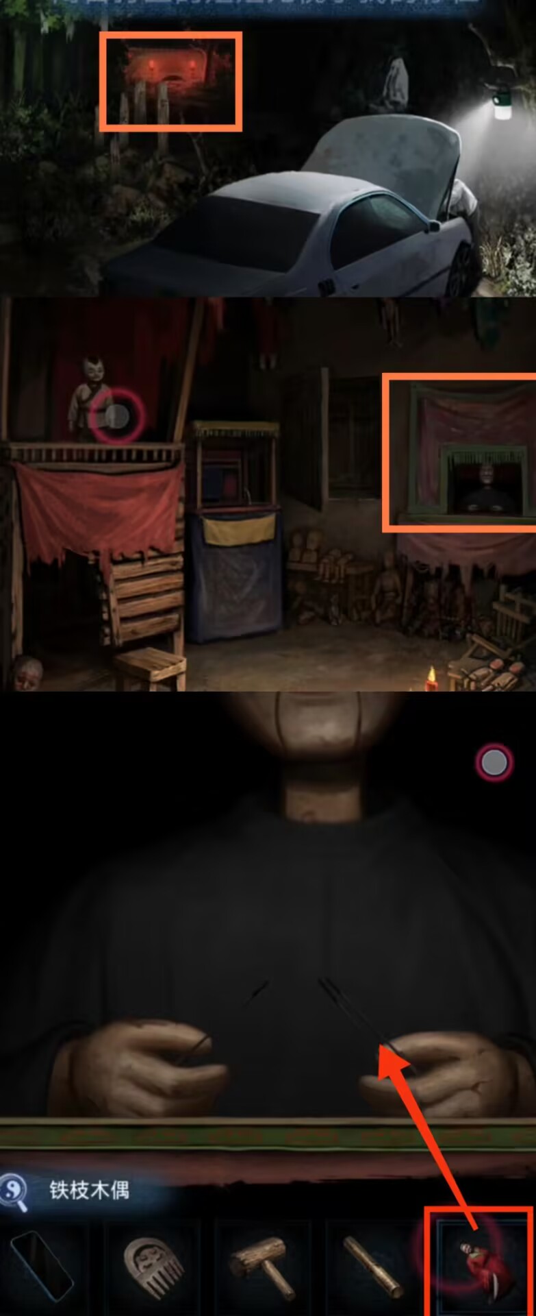 18.进入弃煞牢,调查右侧木偶,使用【铁枝木偶】。结束后注意观察到幕布上的动物头像线索。