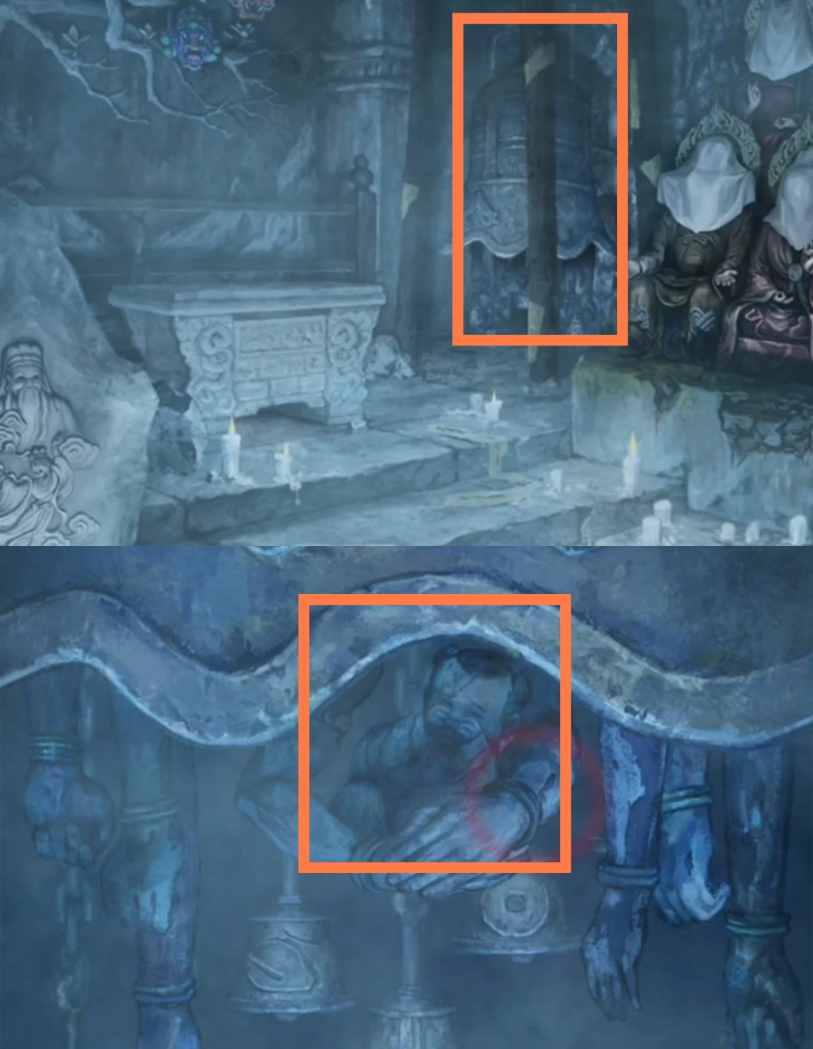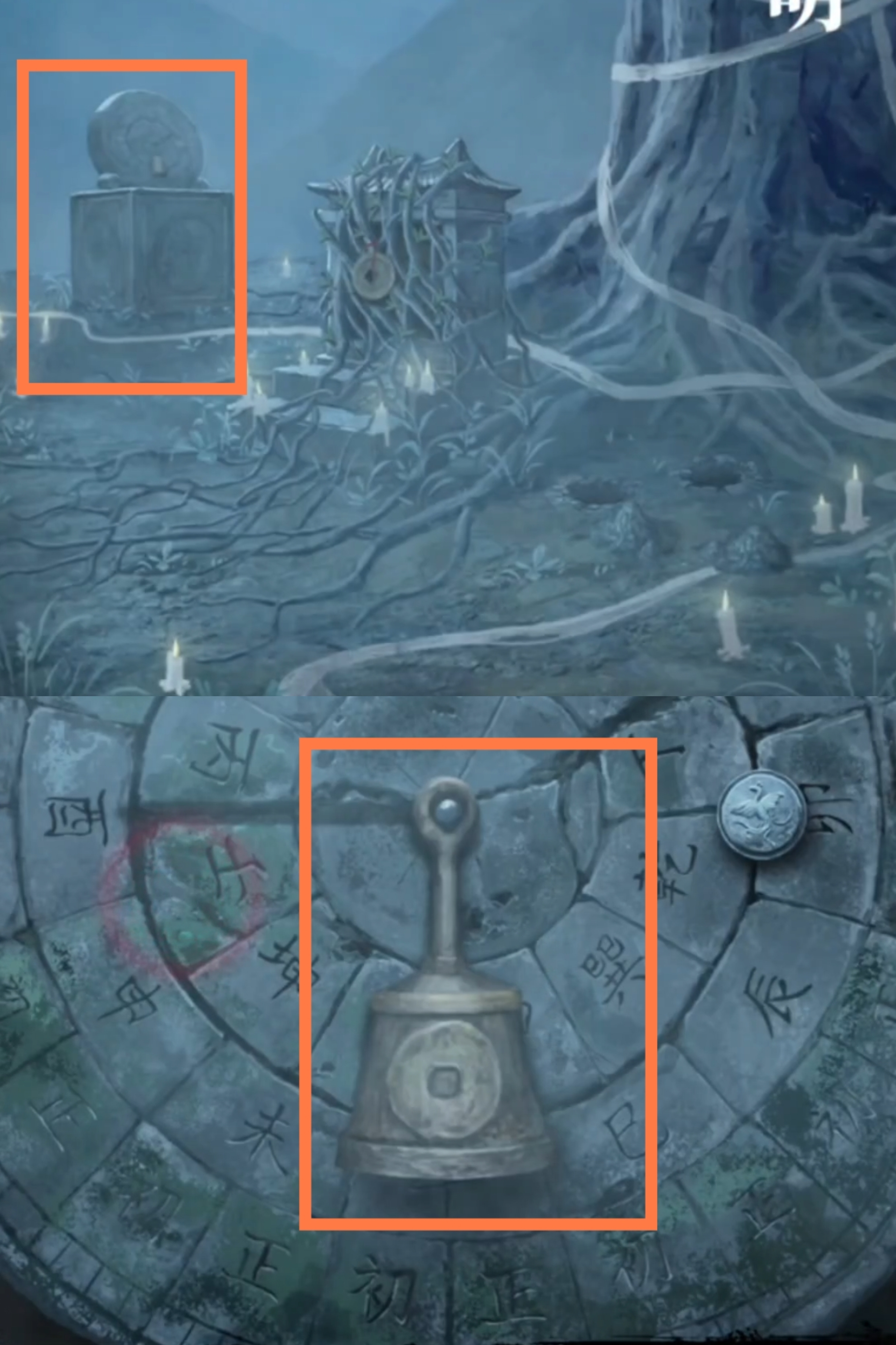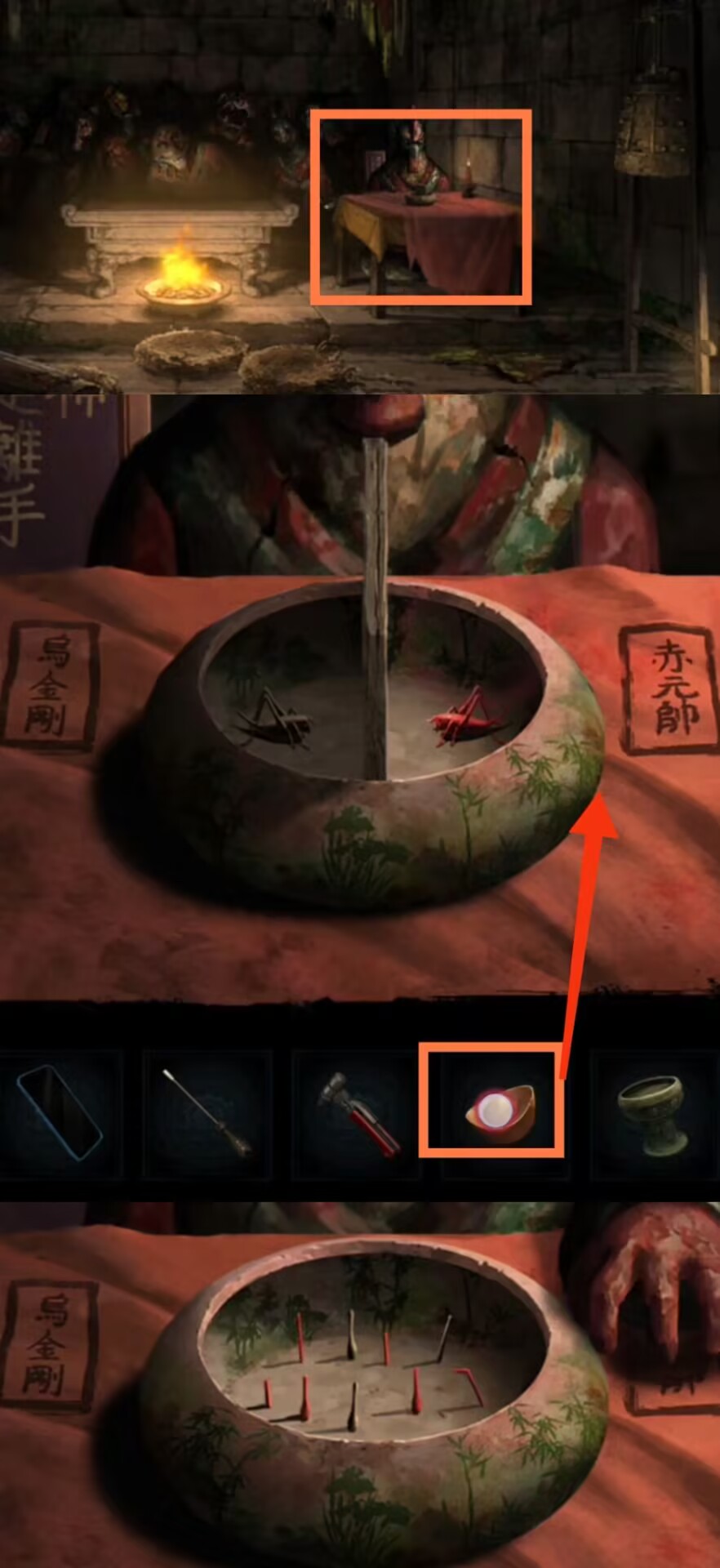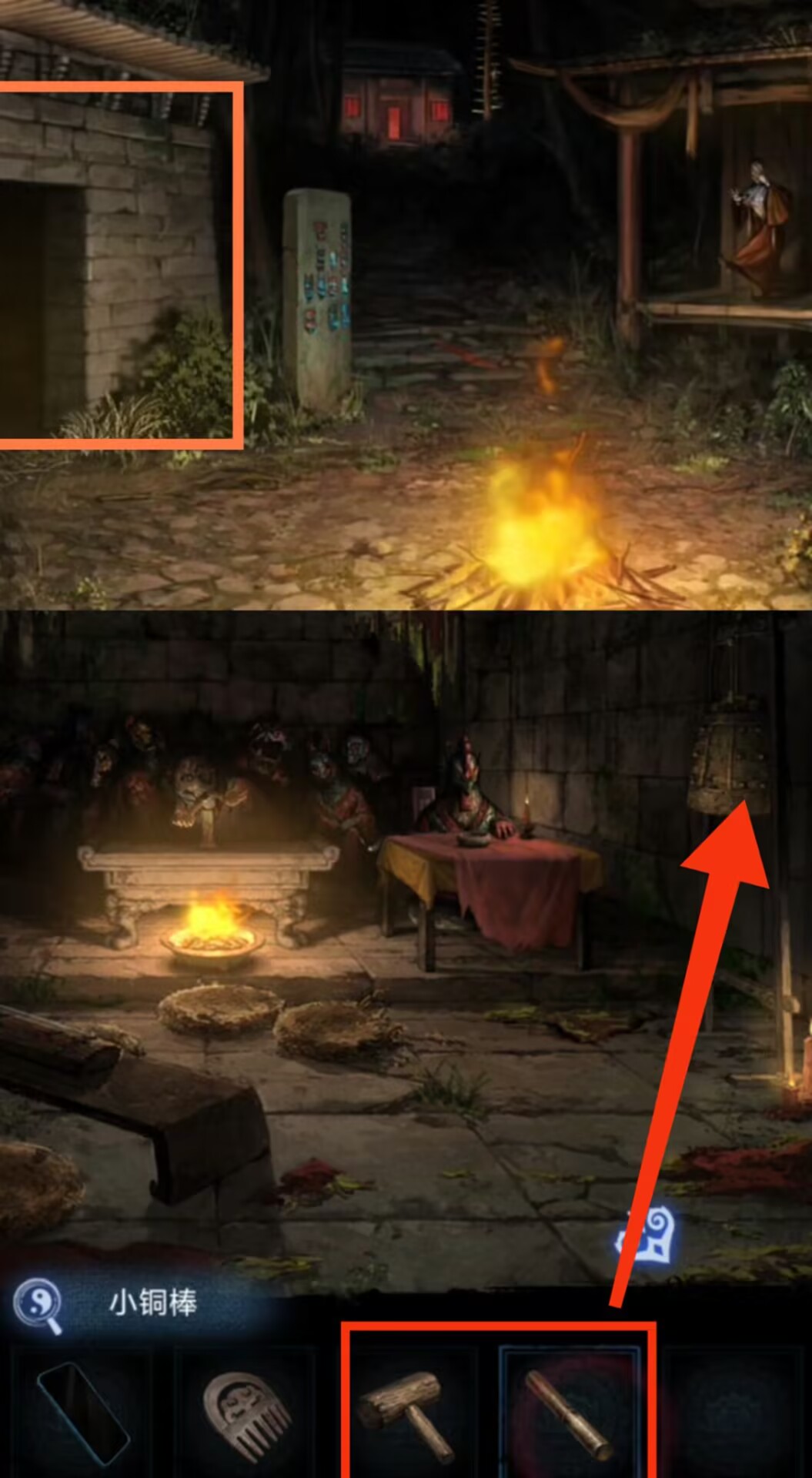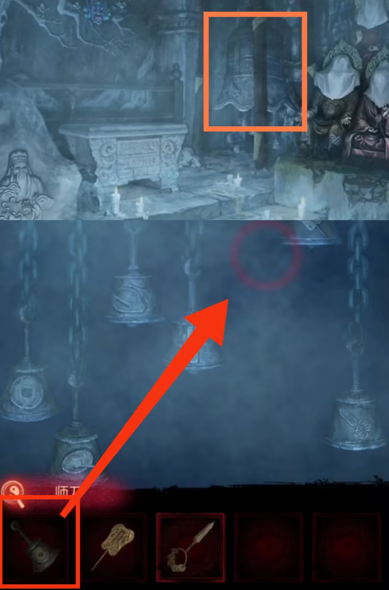 11. 进入塔内,调查供台,使用【布画】,【师刀】。调查大钟上的小铃铛,观察铃铛的高度和图案,自下而上分别为【锣,师刀,铜钱,令牌,木鱼,铜钱,铜扇】。
