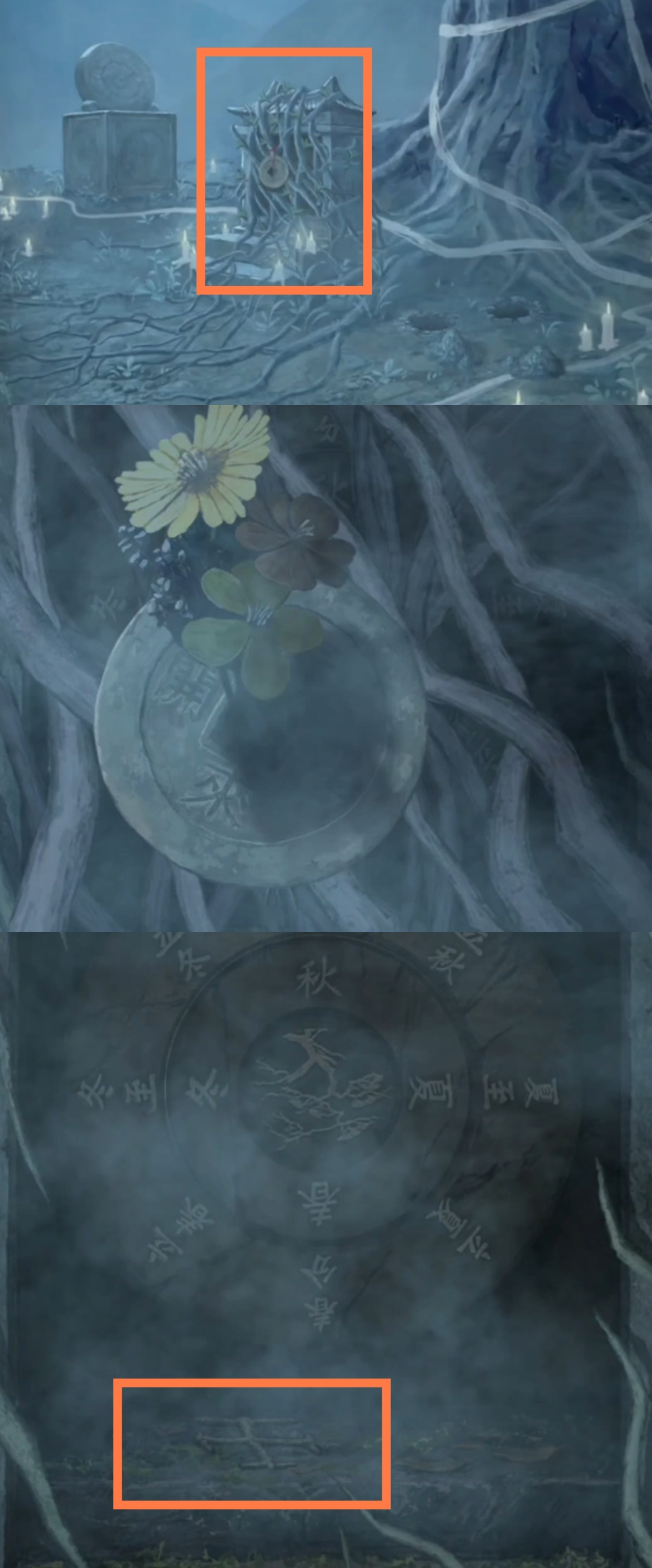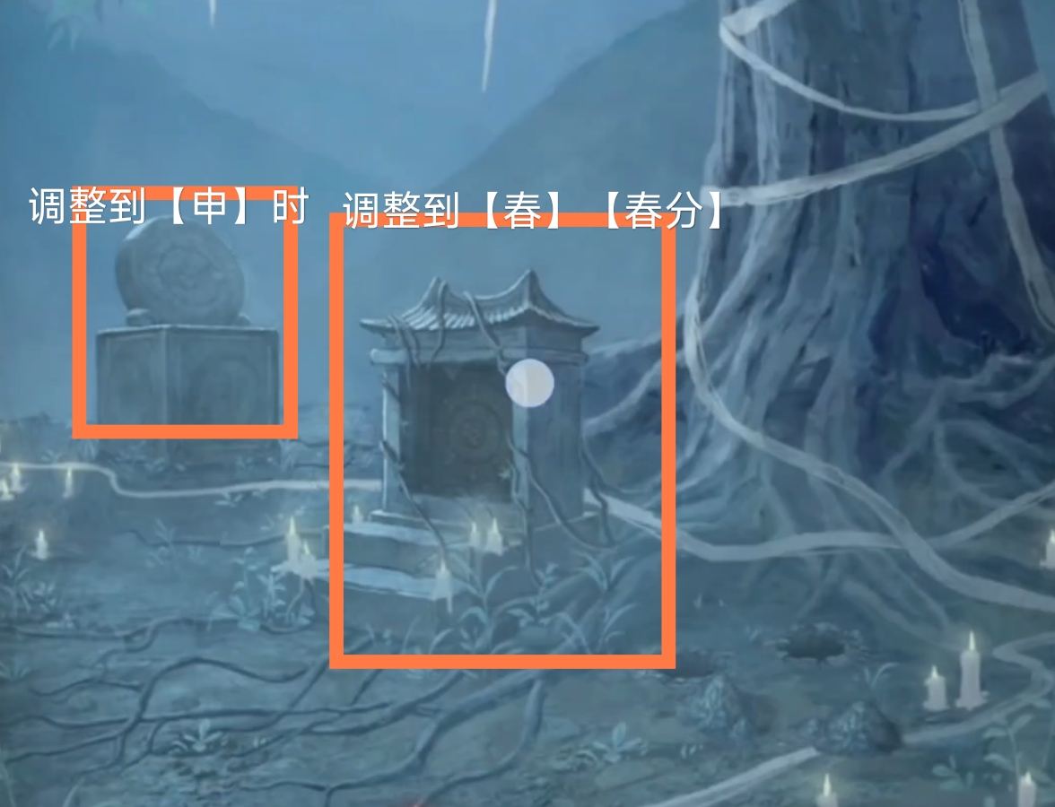 14. 切换至蓝色视角,回到大树场景,调查右侧土坑,使用【襁褓种子】。调查神龛,根据上一步骤中观察到的文字提示,调整为【春分,春朝上】。返回,调查日晷,调整日晷滑块至阴影指向【申】。