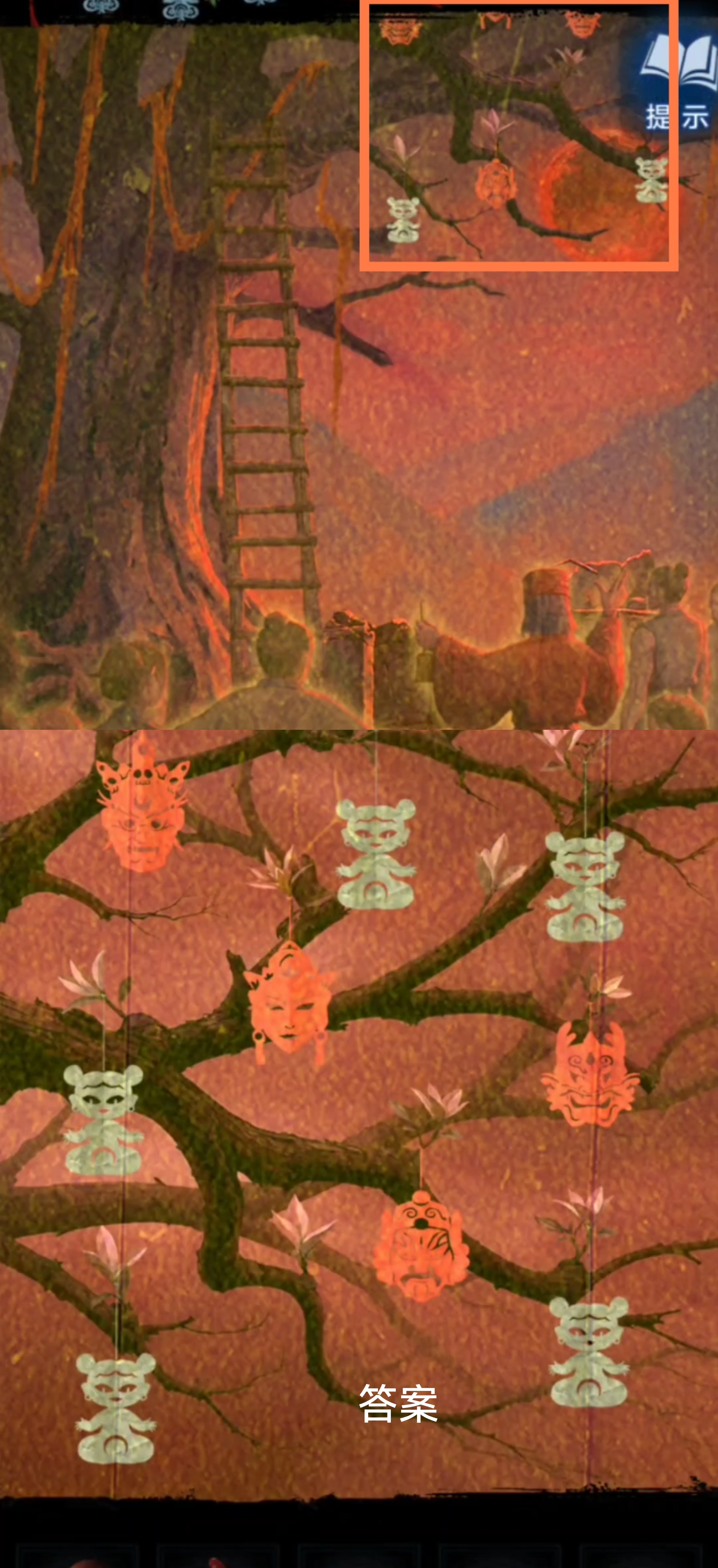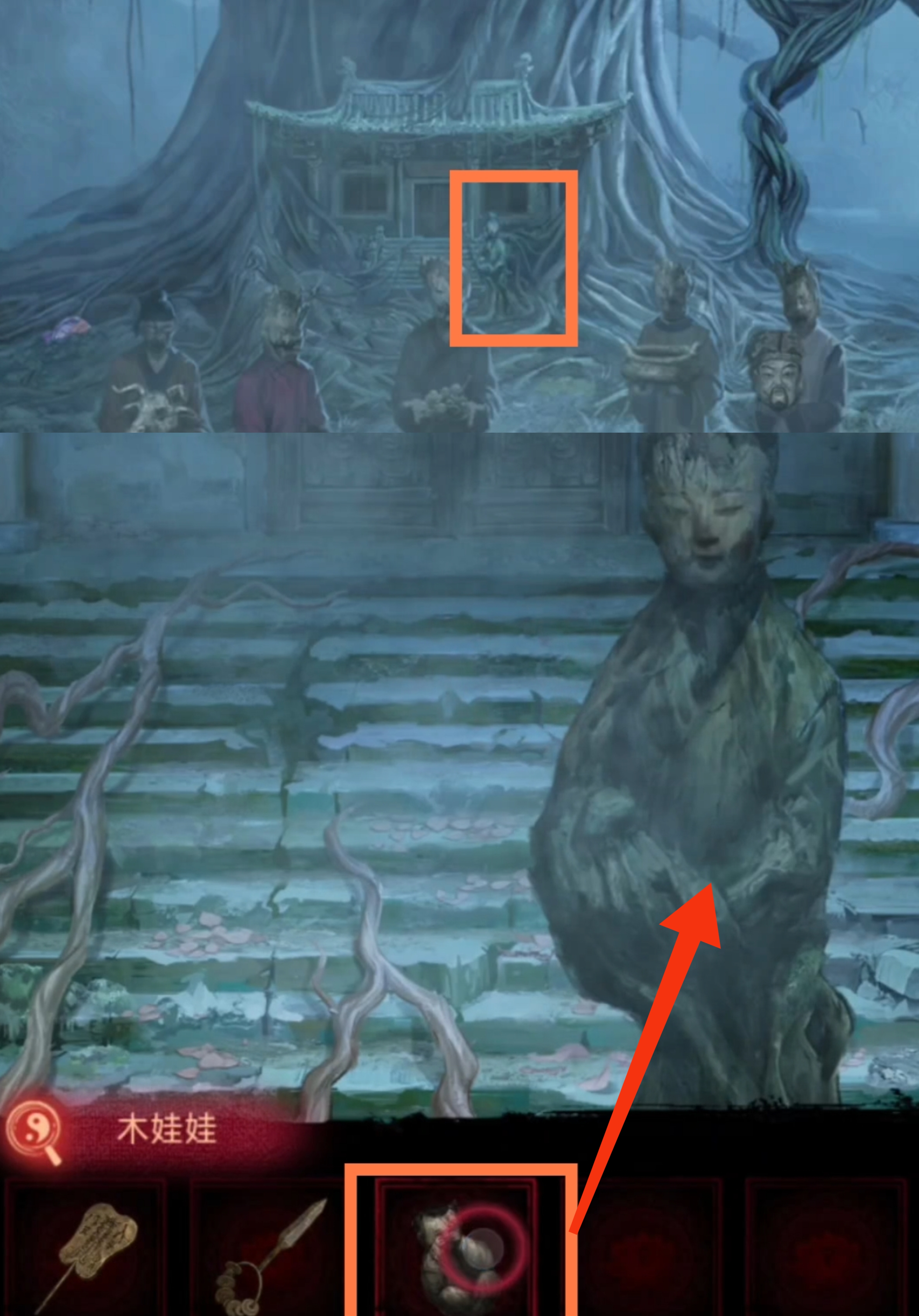 7. 切换至红色视角,回到大树场景。根据上一步骤中观察到大树纸人的位置和塔内浮雕墙上摊面的位置,调整位置。拾取【木娃娃】进入塔内,调查大钟,给予【木娃娃】,获得【玉雕】。