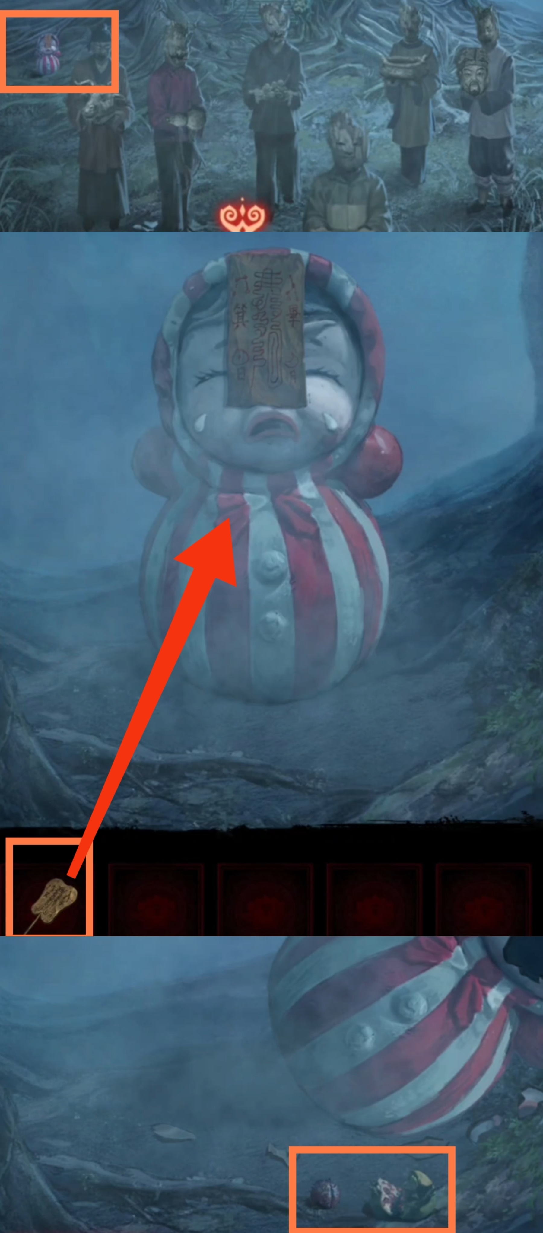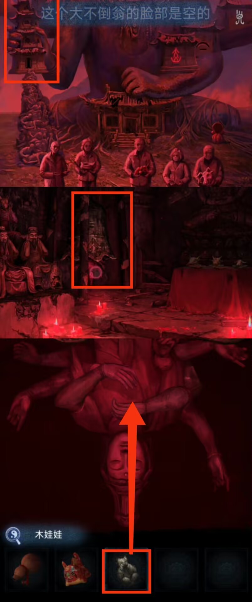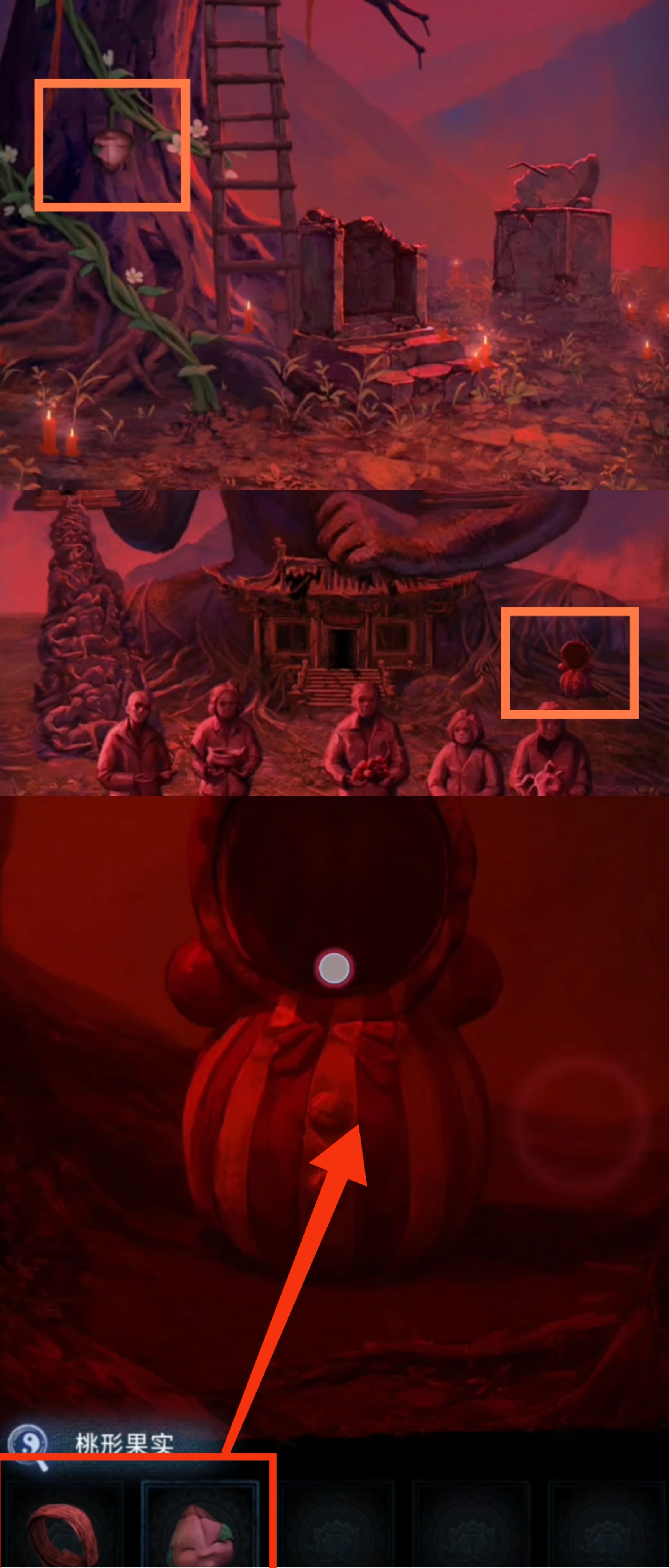 15. 切换至红色视角,回到大树场景,拾取【桃子果实】。进入六葬菩萨场景,调查右侧不倒翁,使用【桃子果实】,【布带】。获得【全家福】。