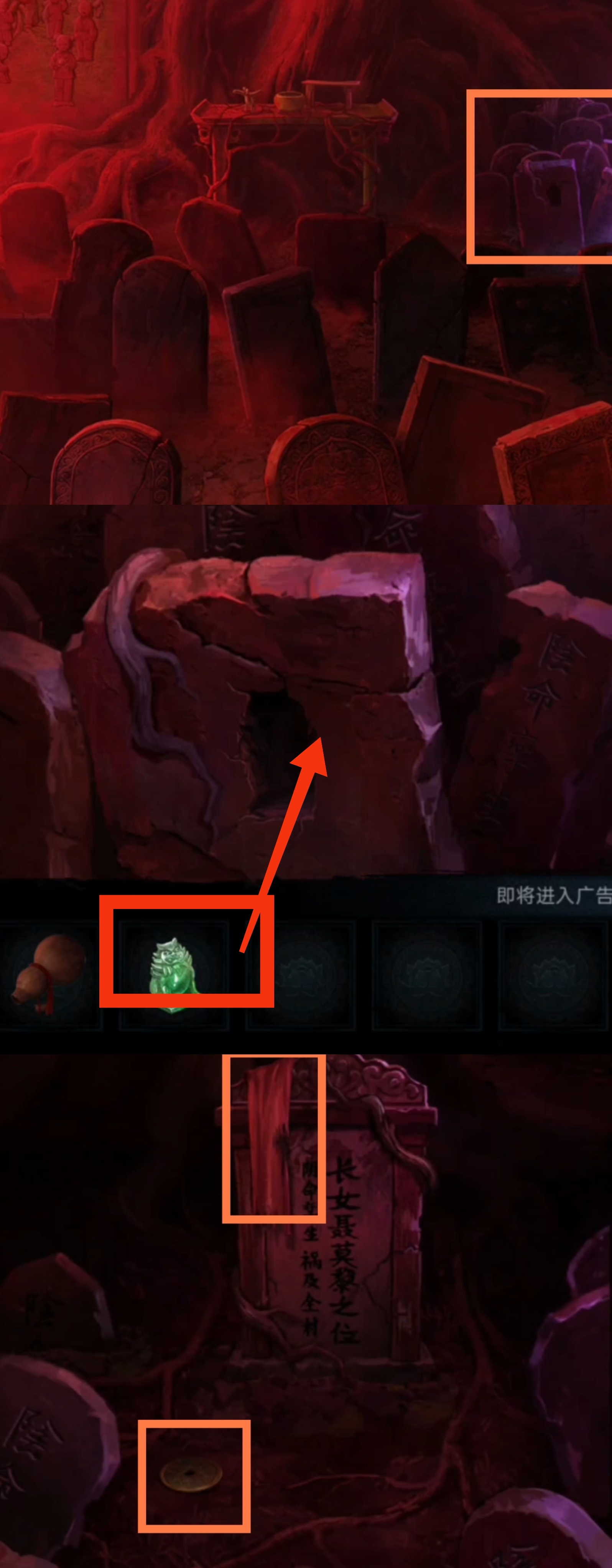 9. 切换至红色视角,进入破庙,调查墓碑,拾取【毽子】,【陶响球】,【小木刀】,【鸠车】。然后根据墓碑上的文字提示,按顺序放置物品。从左到右分别为【布老虎(对应碑文山中孤兽),毽子(对应碑文羽化),小木刀(对应碑文兵灾),陶响球(对应碑文落地哭三声),鸠车(对应碑文乘车升天)】。调查右侧紫光墓碑,使用【玉雕】,拾取【大铜钱】,【布带】。离开破庙,注意观察大佛上符文的颜色。