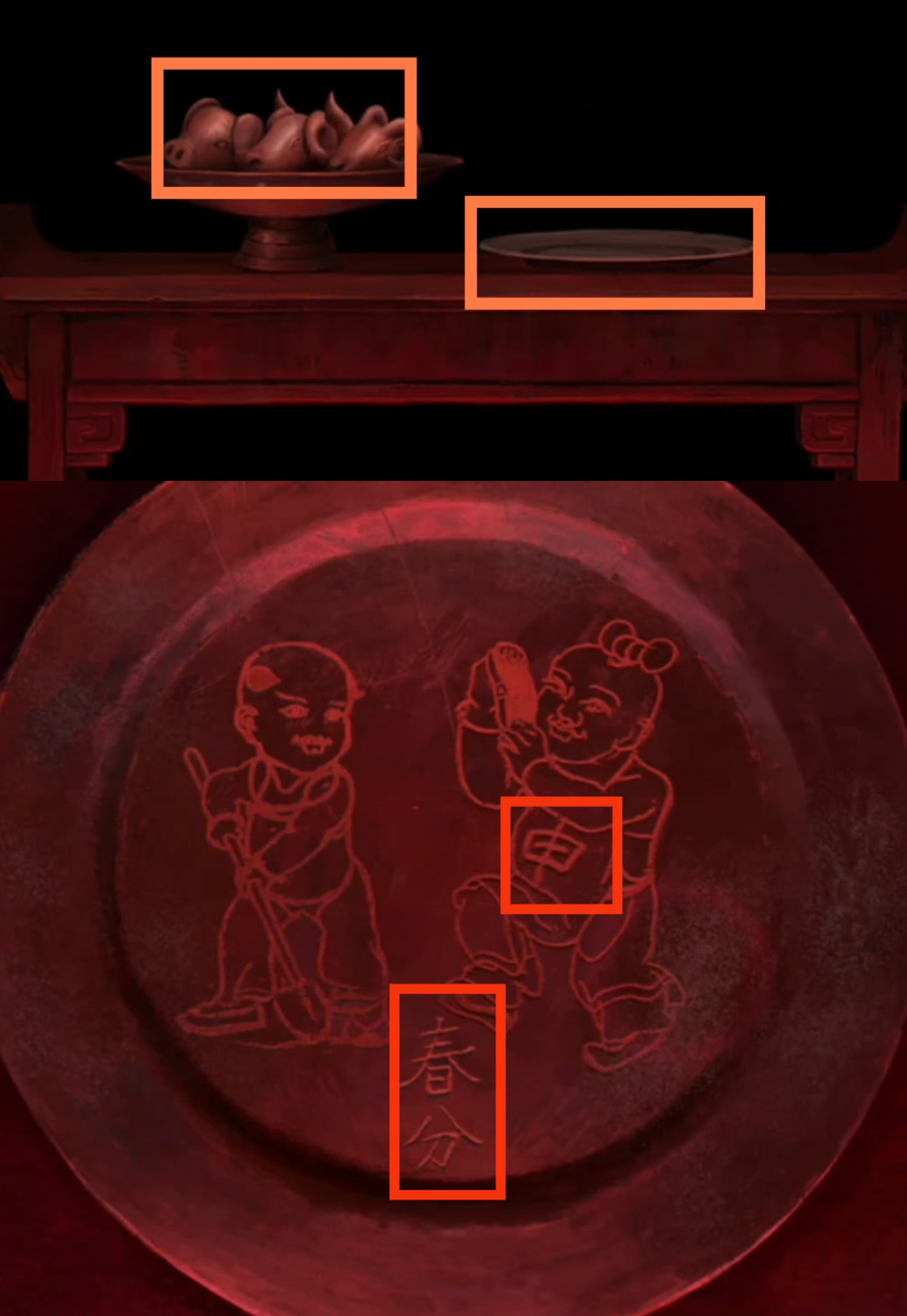 13. 调查右侧空盘子,注意观察上面的文字提示【春分,申】。