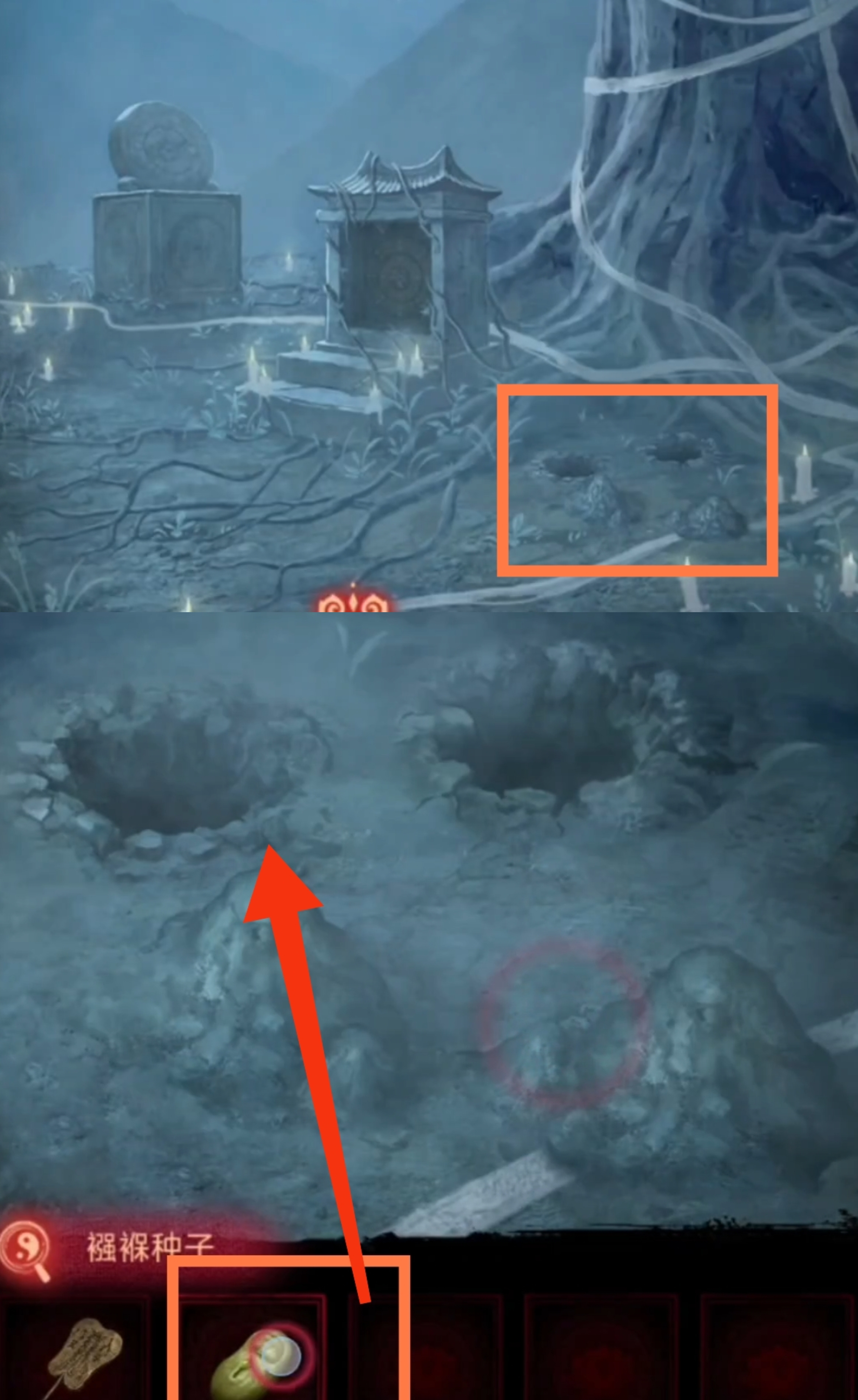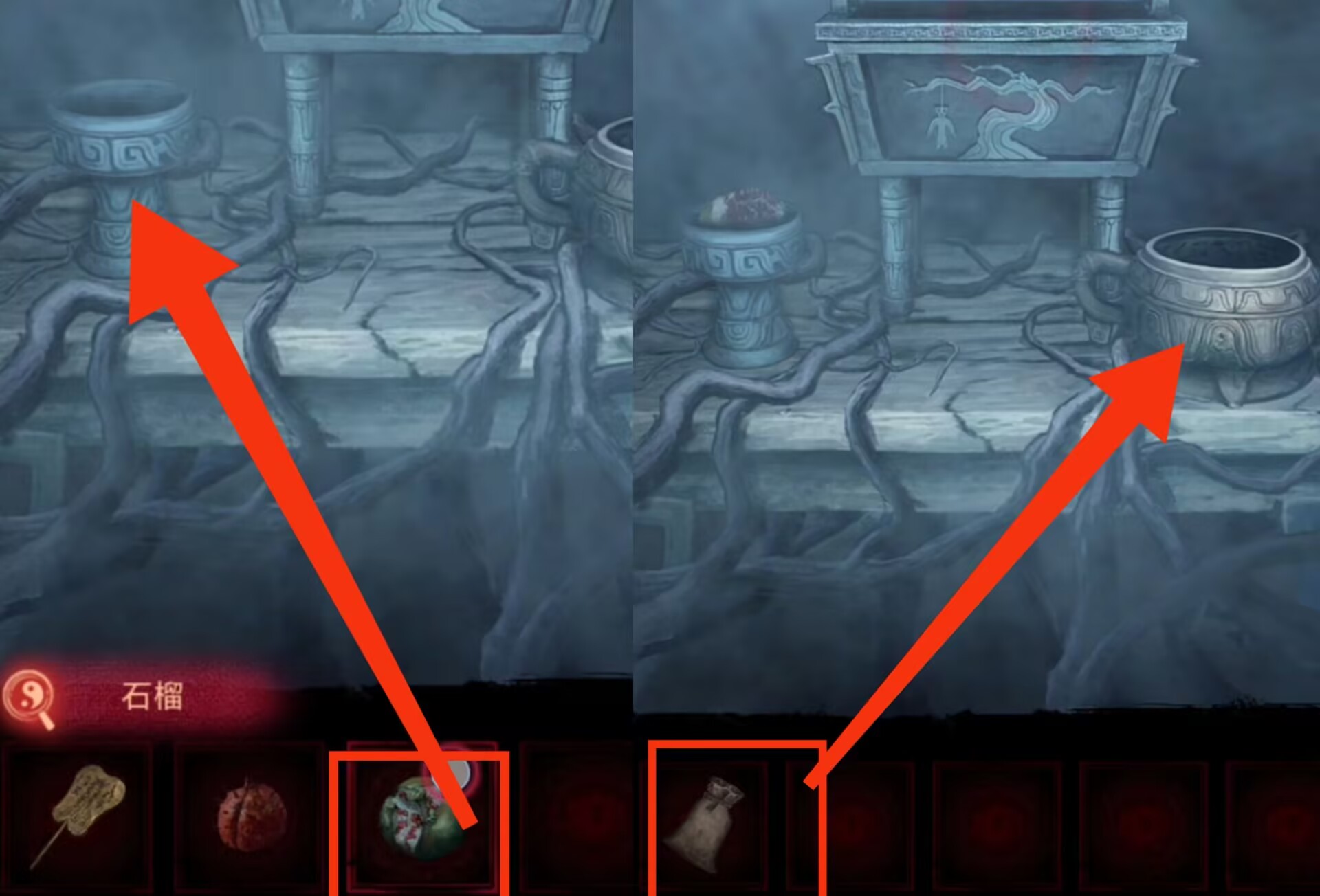 22. 进入破庙,对右侧使用【五谷】。对左侧使用【石榴】。