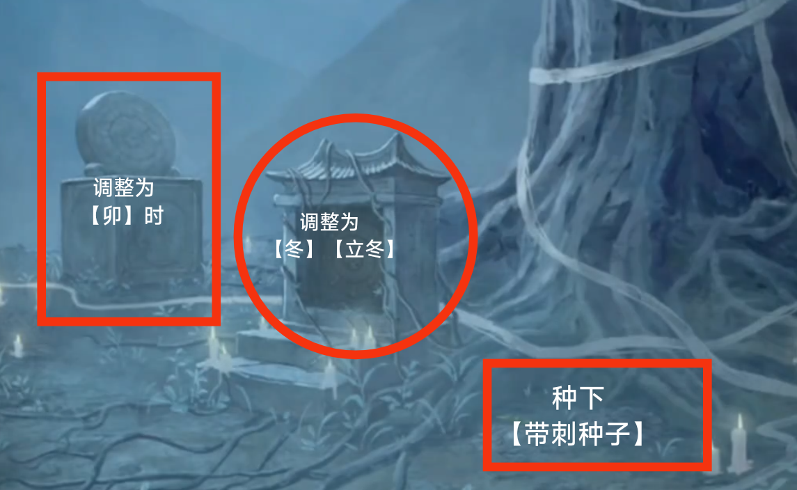 18. 切换至蓝色视角,进入大树场景,调查土坑,使用【带刺种子】。根据上一步骤中观察到的线索,调查神龛,调整为【立冬,冬,朝上】;调整日晷滑块至阴影指向【卯】。
