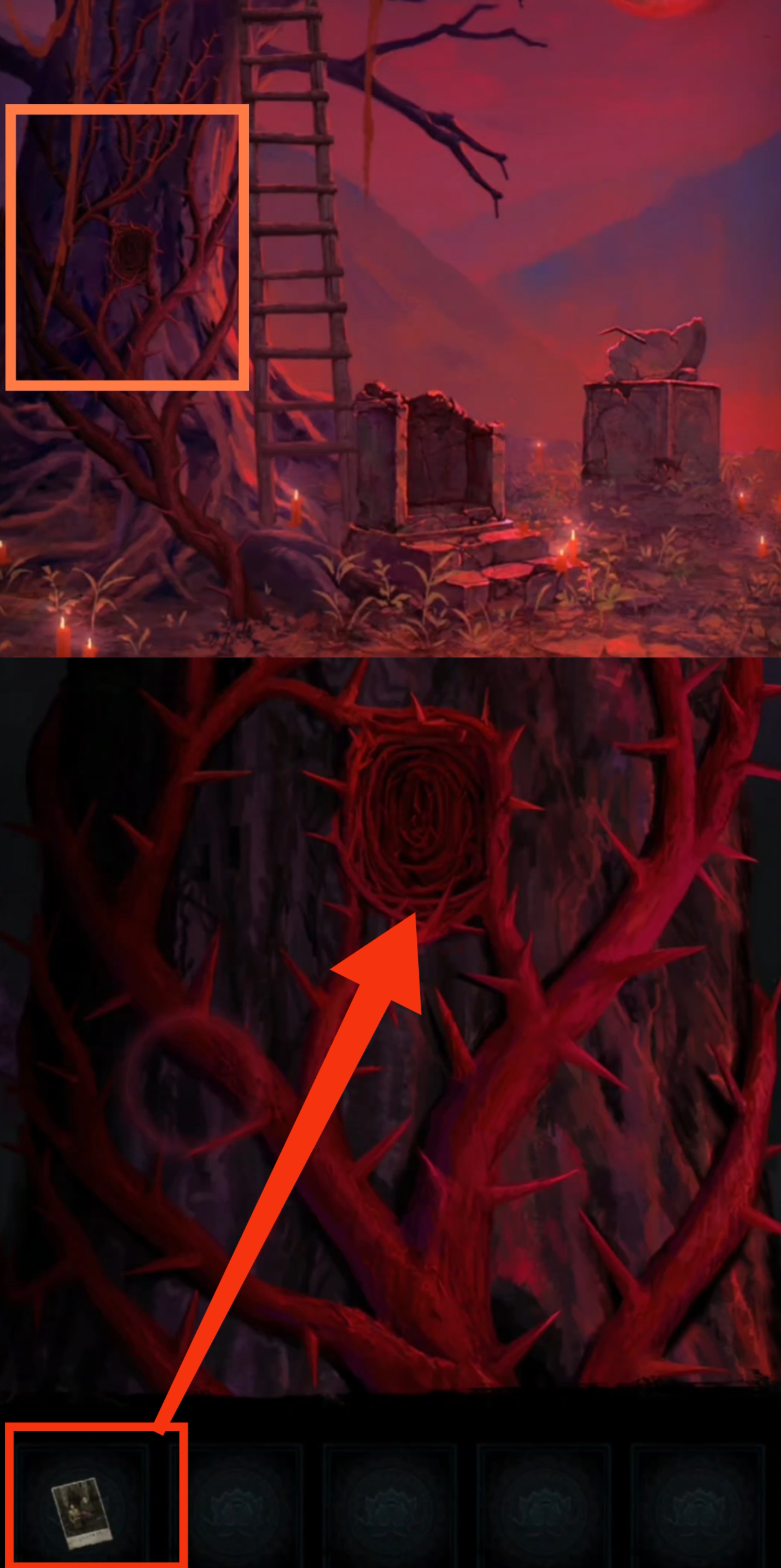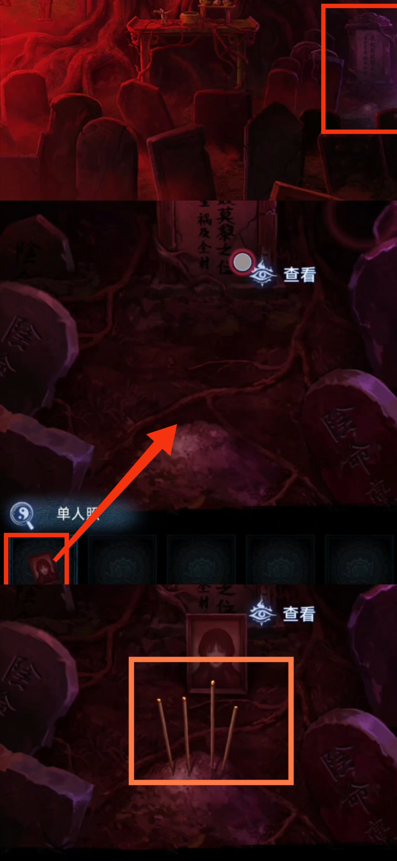19. 切换至红色视角,回到大树场景,调查大树,在方形凹槽内放置【全家福】。拾取【单人照】。