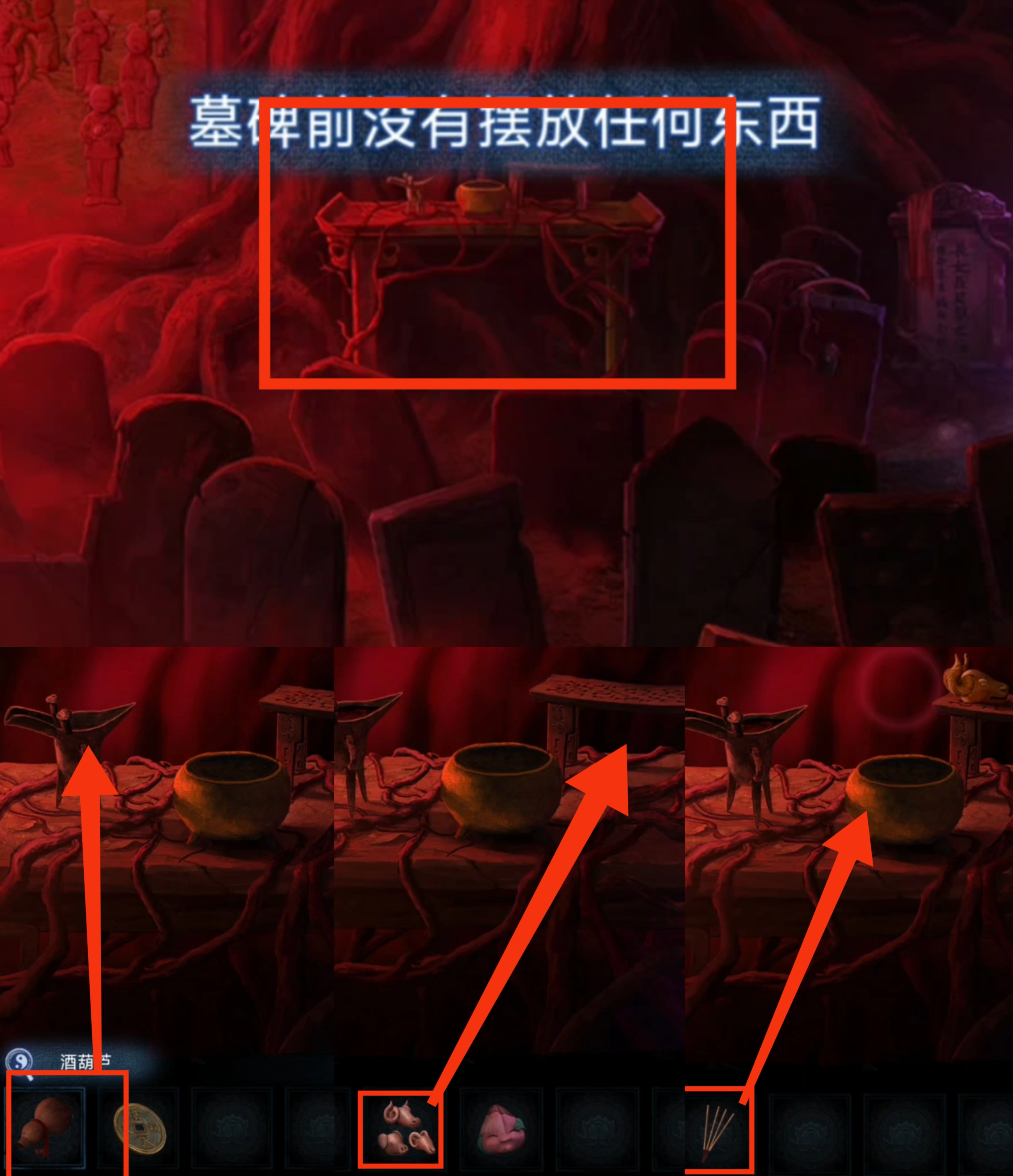 20. 进入破庙,调查右侧莫黎墓碑,使用【单人照】。拾取【四根香】。调查供台,在右侧放置【三牲首像】。对左侧酒杯使用【酒葫芦】。对中间香炉使用【四根香】。