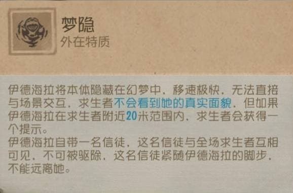 ②求生者不会看到梦之女巫本体的真实面貌,但当伊德海拉隐藏在求生者附近20m范围内的幻梦中时,求生者会获得【梦隐】提示。当求生者出现【梦隐】标志时,求生者应尽快进入牵制状态,转向安全点位;