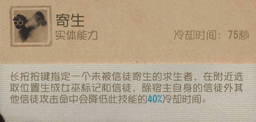 ③任意信徒攻击命中非宿主的求生者本体后,会降低40%寄生技能冷却时间。
