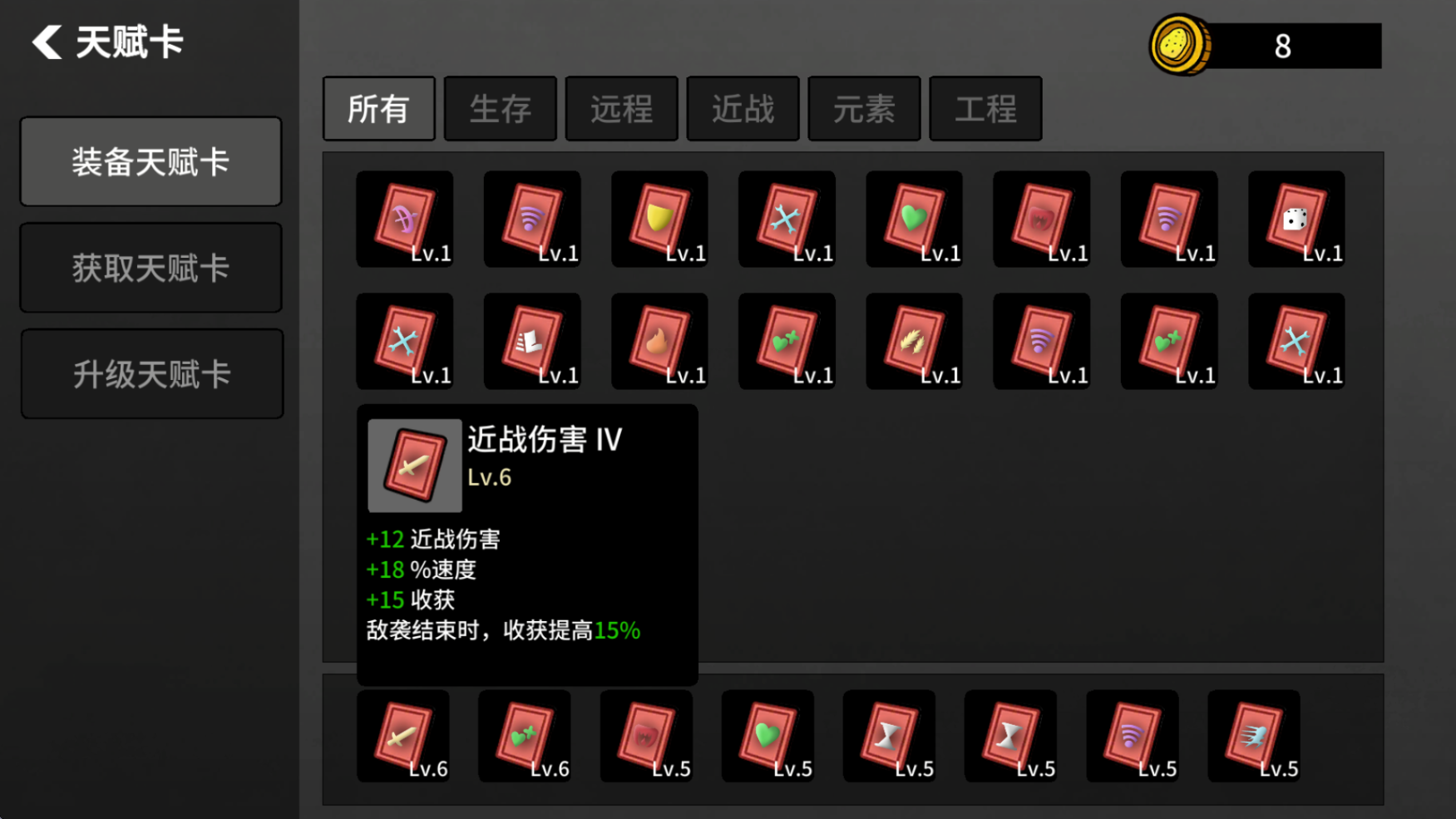 ①最重要的就是天赋卡了,只有 红色天赋卡 有 附加词条,需要的词条是:“敌袭结束时,收货提高5%”。如下图所示,8张都要这个,我有两张升到了6级,其它都是5级。