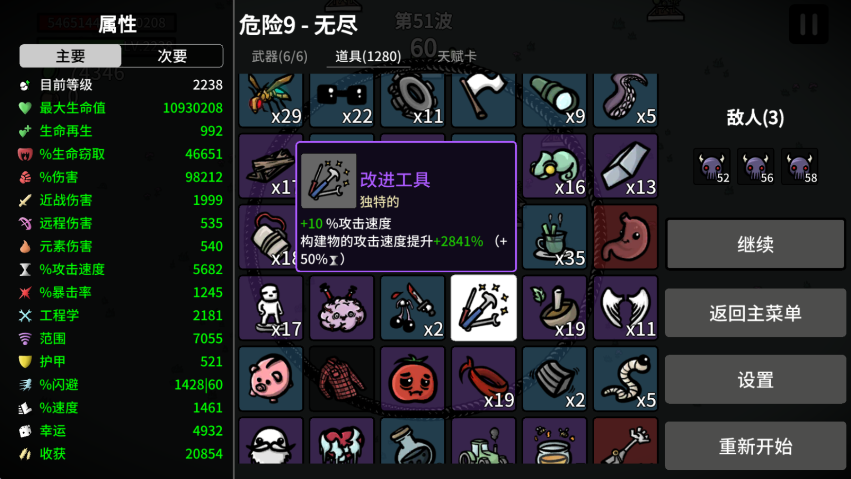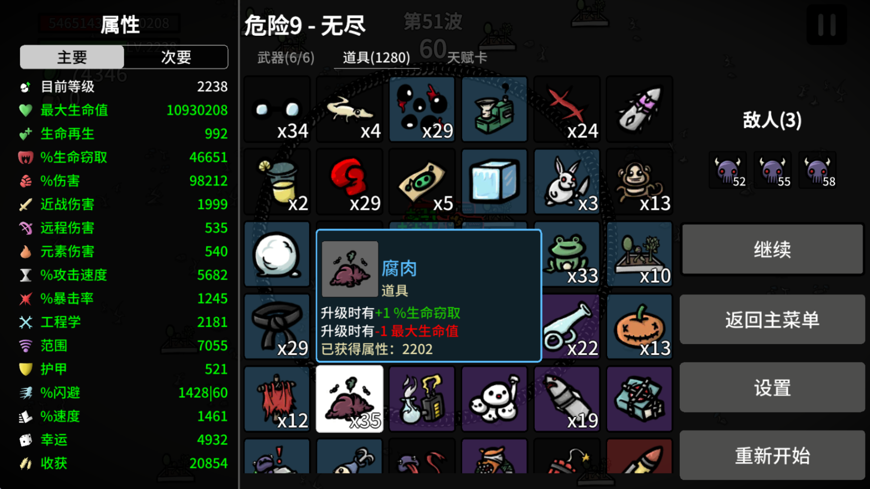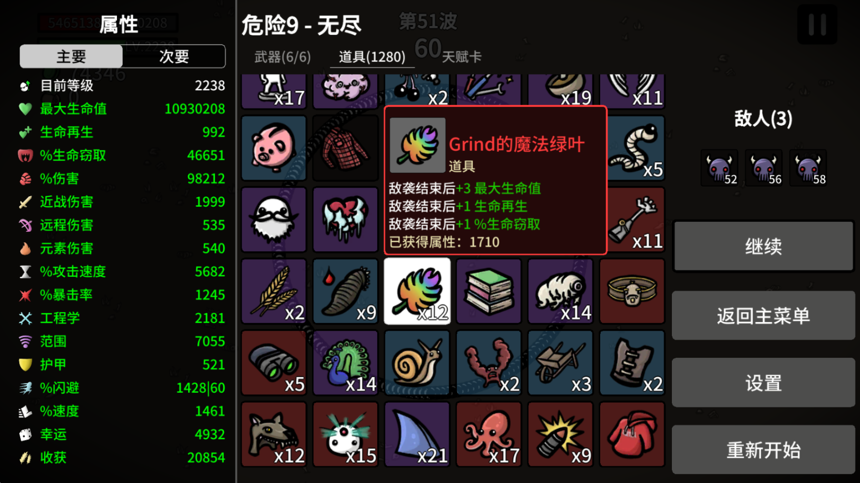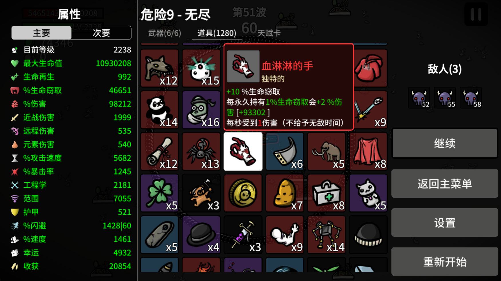 ③接下来就是该流派的伤害来源了,最重要的道具组合 血淋淋的手、腐肉 以及 Grind的魔法绿叶,腐肉 和 Grind的魔法绿叶 越多越好!由于 腐肉 是看等级的,所以各种加经验的道具看见就拿!我2000+的等级就是这么来的!40波后就不用拿 加经验的道具 了,因为此时 收获 已经非常低了,拿了也没用了。由于 Grind的魔法绿叶 是红色的,所以基本都是15波左右才能刷出来,我运气不太好只刷了12个,所以我觉得这玩意其实不太重要。从下图可以看到,我9w+的伤害基本都是来自 血淋淋的手,而 生命偷取 基本都是来自 腐肉。