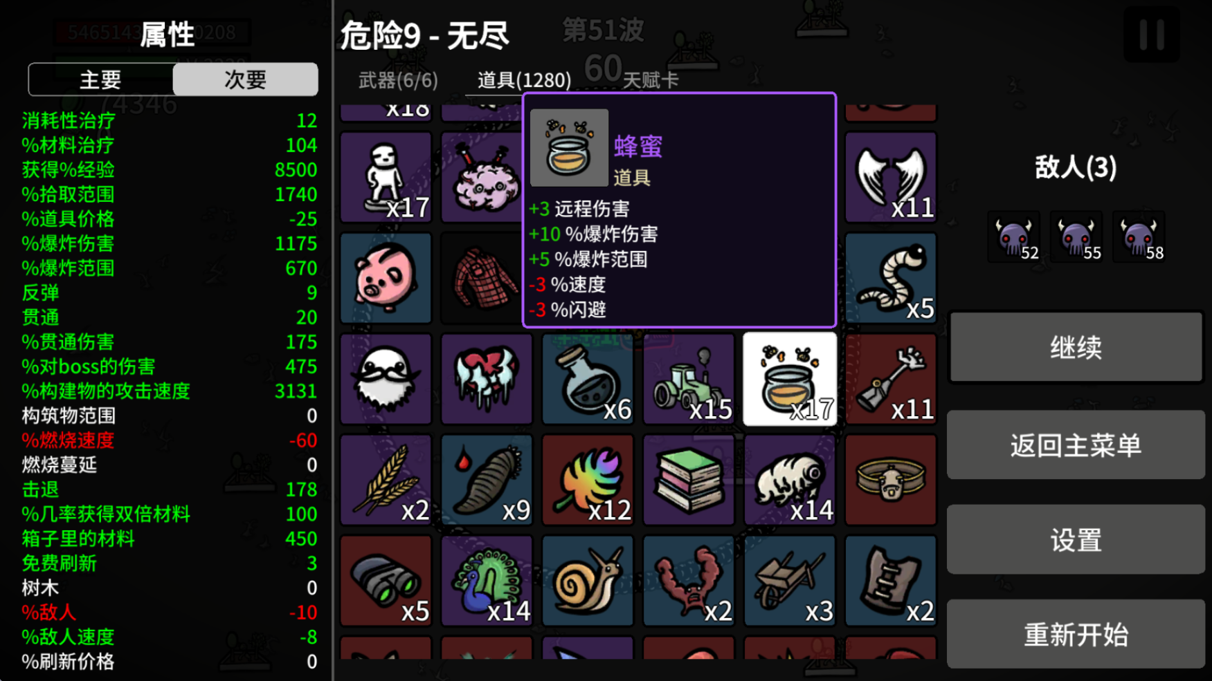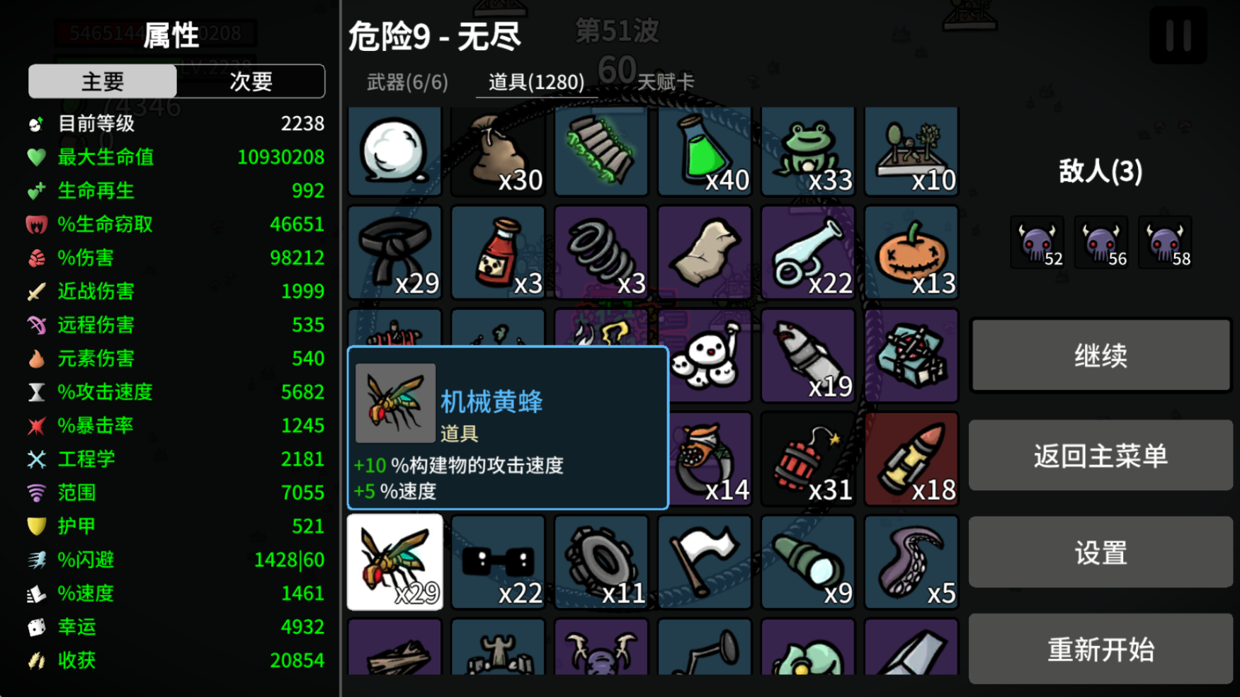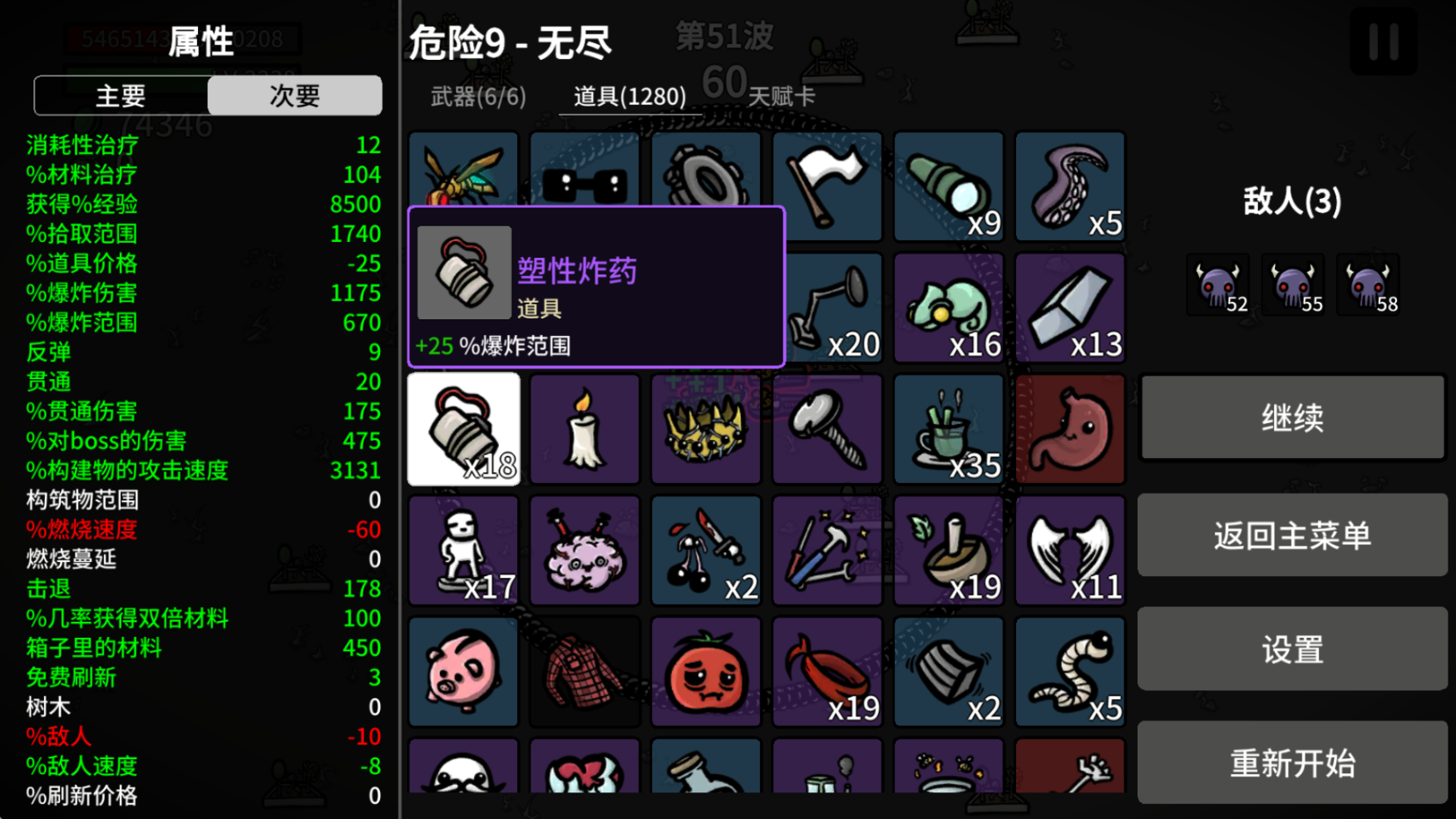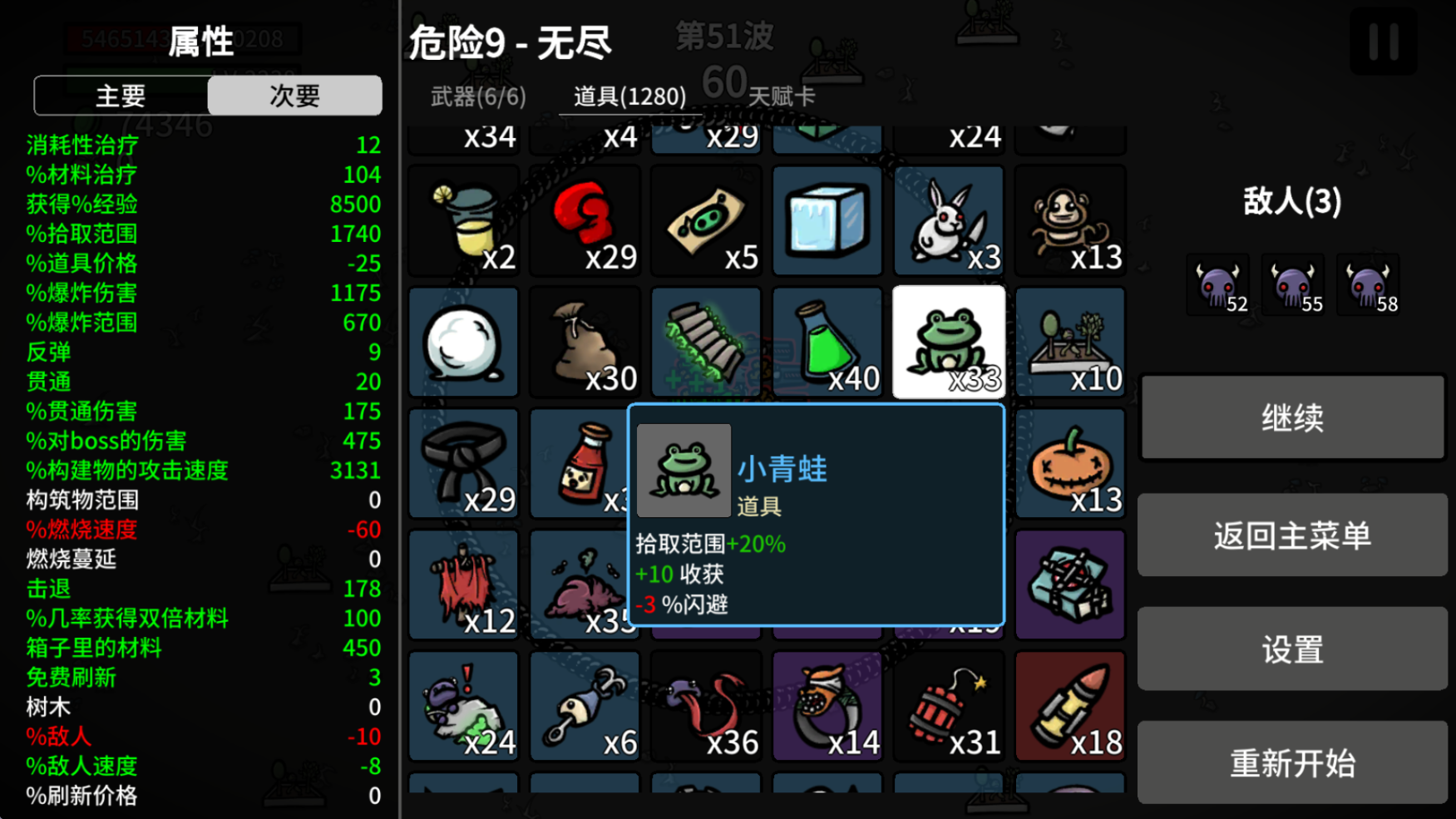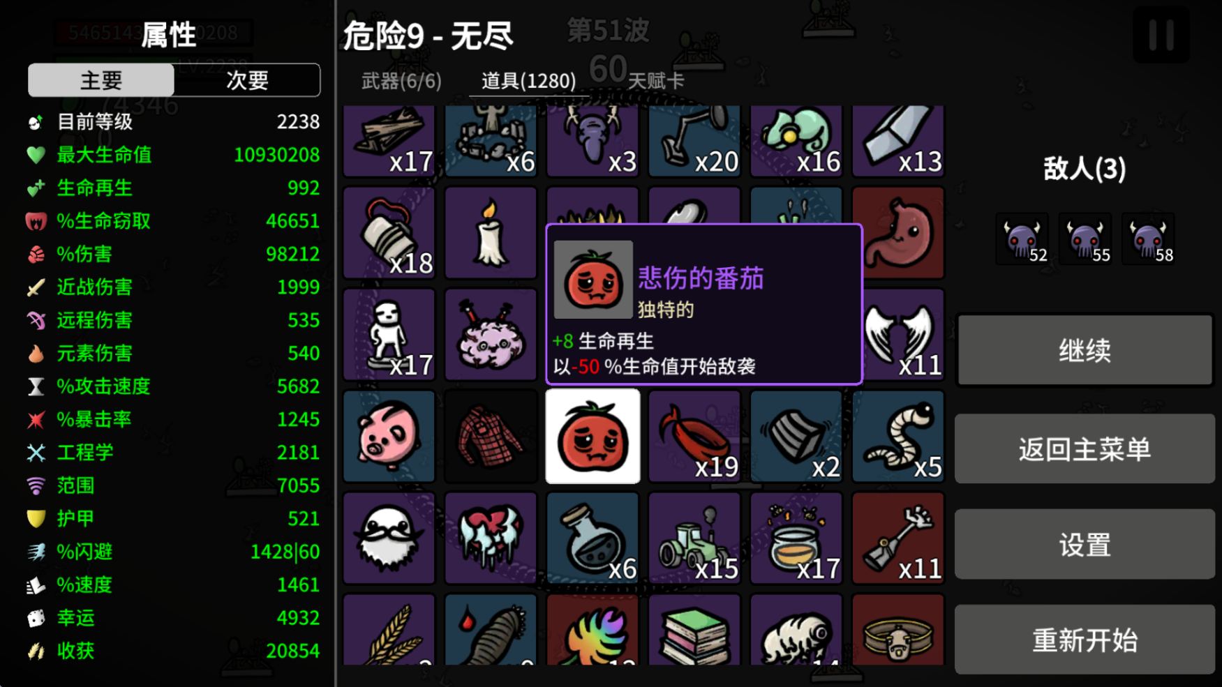 ③接下来就是该流派的伤害来源了,最重要的道具组合 血淋淋的手、腐肉 以及 Grind的魔法绿叶,腐肉 和 Grind的魔法绿叶 越多越好!由于 腐肉 是看等级的,所以各种加经验的道具看见就拿!我2000+的等级就是这么来的!40波后就不用拿 加经验的道具 了,因为此时 收获 已经非常低了,拿了也没用了。由于 Grind的魔法绿叶 是红色的,所以基本都是15波左右才能刷出来,我运气不太好只刷了12个,所以我觉得这玩意其实不太重要。从下图可以看到,我9w+的伤害基本都是来自 血淋淋的手,而 生命偷取 基本都是来自 腐肉。