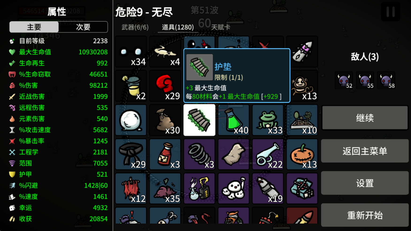 ②通过 封面图 可知,土豆发射器 的伤害是和 生命值 挂钩的!所以这个流派就是堆 最大生命值 的。因此玩的角色自然是首选 恶魔 啦!其它角色只能 依靠道具 护垫。道具 护垫 对 恶魔 来说 前20波 还是非常有用的。不过因为 恶魔 的特性,到后面 护垫 基本就没用了!