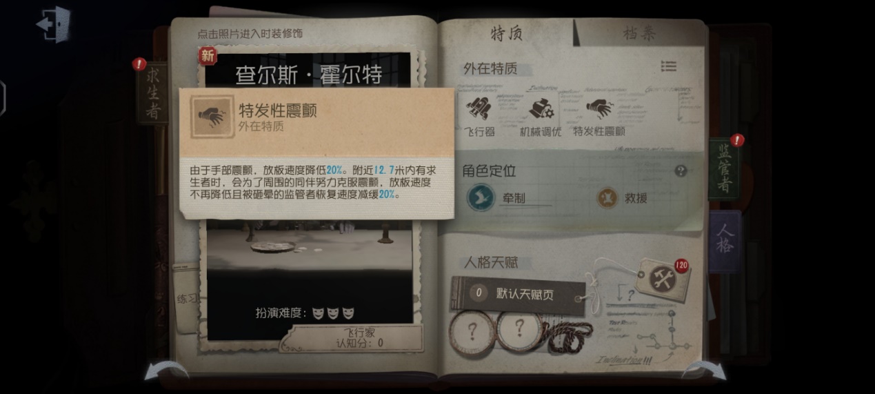 飞行家的飞行器有着不错的拉点能力,但是CD较长。携带【飞轮效应】可以有效过度渡出飞行器CD,避免在技能冷却期间吃刀。【结伴效应】可以在被队员救援后创造更大的二次牵制空间。3点【假寐】可以使飞行家能够在狂欢之椅上坚持更长时间,为队友争取更多的破译进度。
