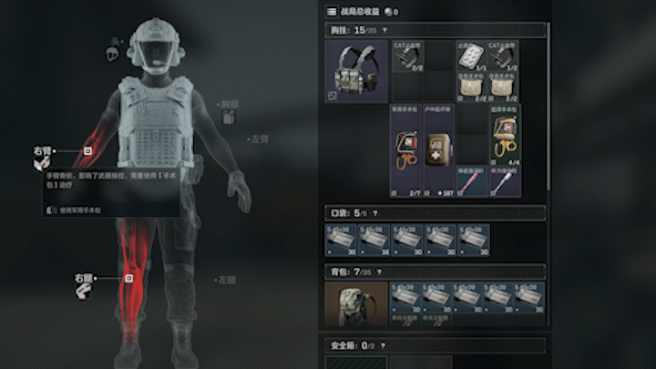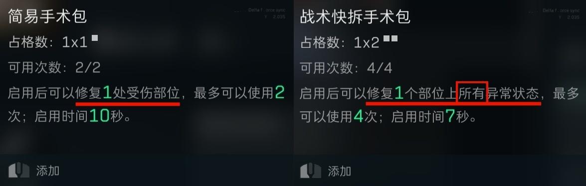 这类影响作战能力的异常状态,即便没有持续造成健康值下降,也需要尽快使用手术包修复。当然手术包也分为好几种。简易手术包启用后可以修复1处受伤部位,且最多使用两次。品质更好的手术包,则可以同时修复1个部位上的所有异常状态,使用次数也更多。