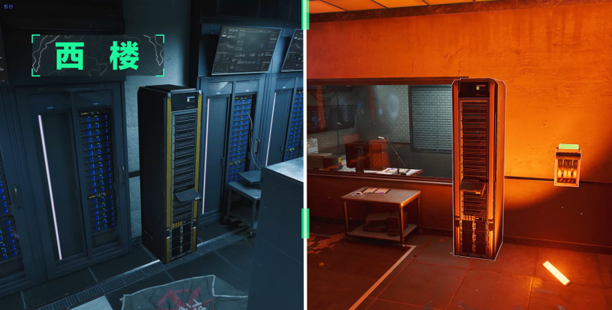 另一侧的西楼,因中部有天窗存在,内部房间环绕四周。有大约13个固定物资点,包括两台服务器,可供破解下载机密资料的电脑,不要错过。