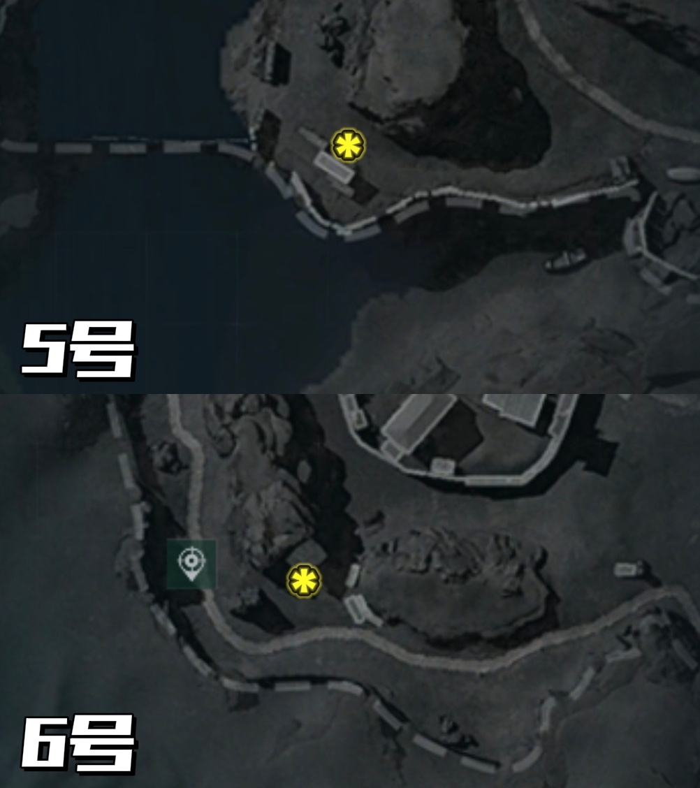 5号藏宝点位就在河滩物资箱的旁边,位置找起来还算简单,寻找难度两颗星;六号点位就在军营下方复活点的木箱上,位置比较偏僻,寻找难度一坤星。