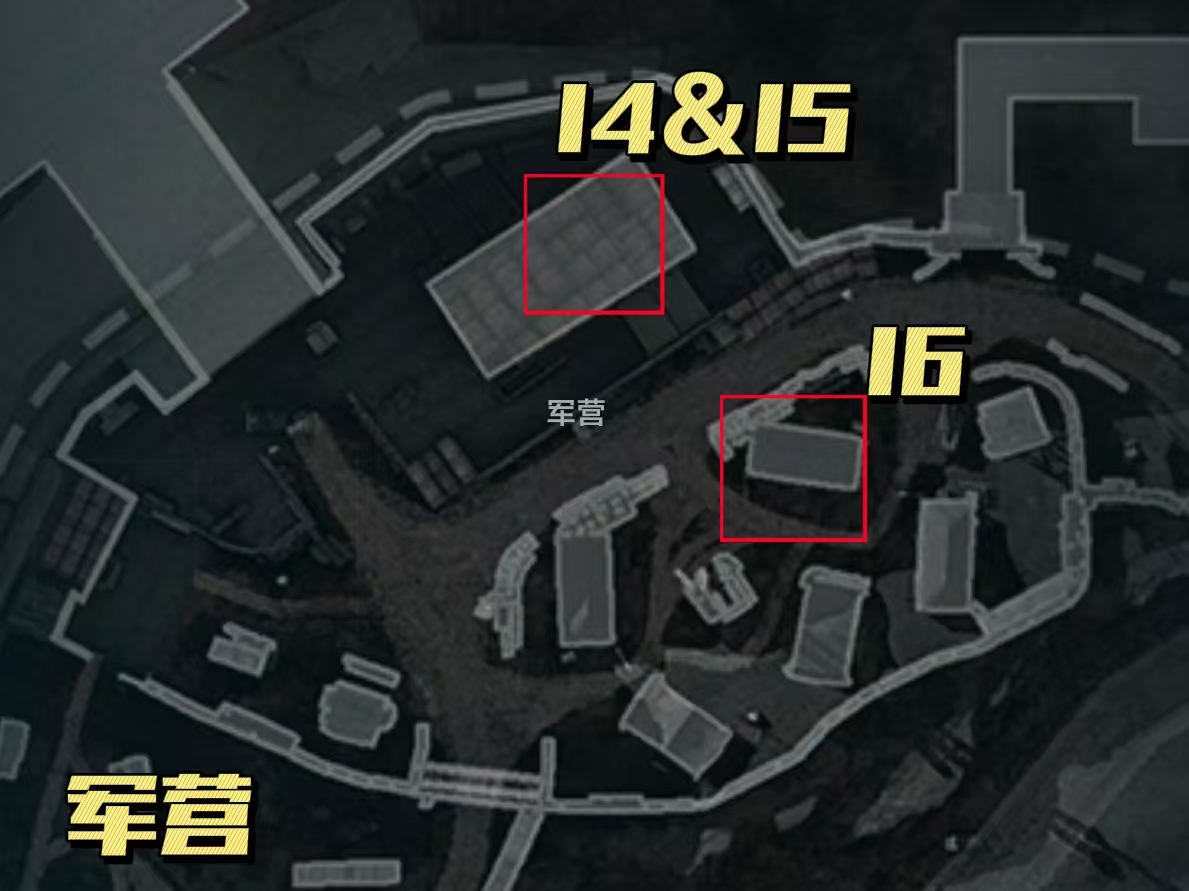 接下来我们直接来到军营的二楼,14号点位和15号点位离得比较近,找到床铺正对着的木头制大桌子(上面会刷小保险),渡鸦之眼就会刷新在桌子下方的空洞里,而另一个点位就在床铺边上红色塑料框内(面对着一个白色的小桌子);16号点位就在会刷大免保的帐篷里面,一个红色塑料筐和一个灰色的小盒子(货架旁边),渡鸦之眼会刷新在红色塑料筐内部。