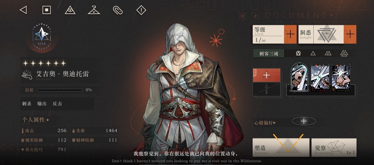 赋予目标【刺客印记】(1层,塑2提升至2层),队友攻击带印记目标时,艾吉奥触发追击(消耗印记,释放1技能)。