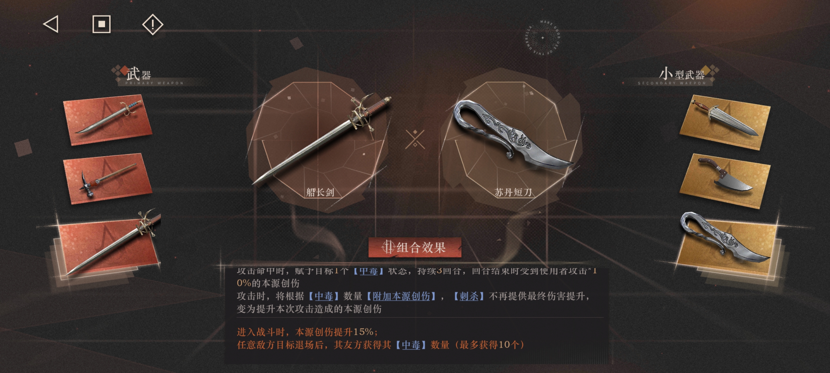 副武器:苏丹短刀(延长反击,持续叠毒)。