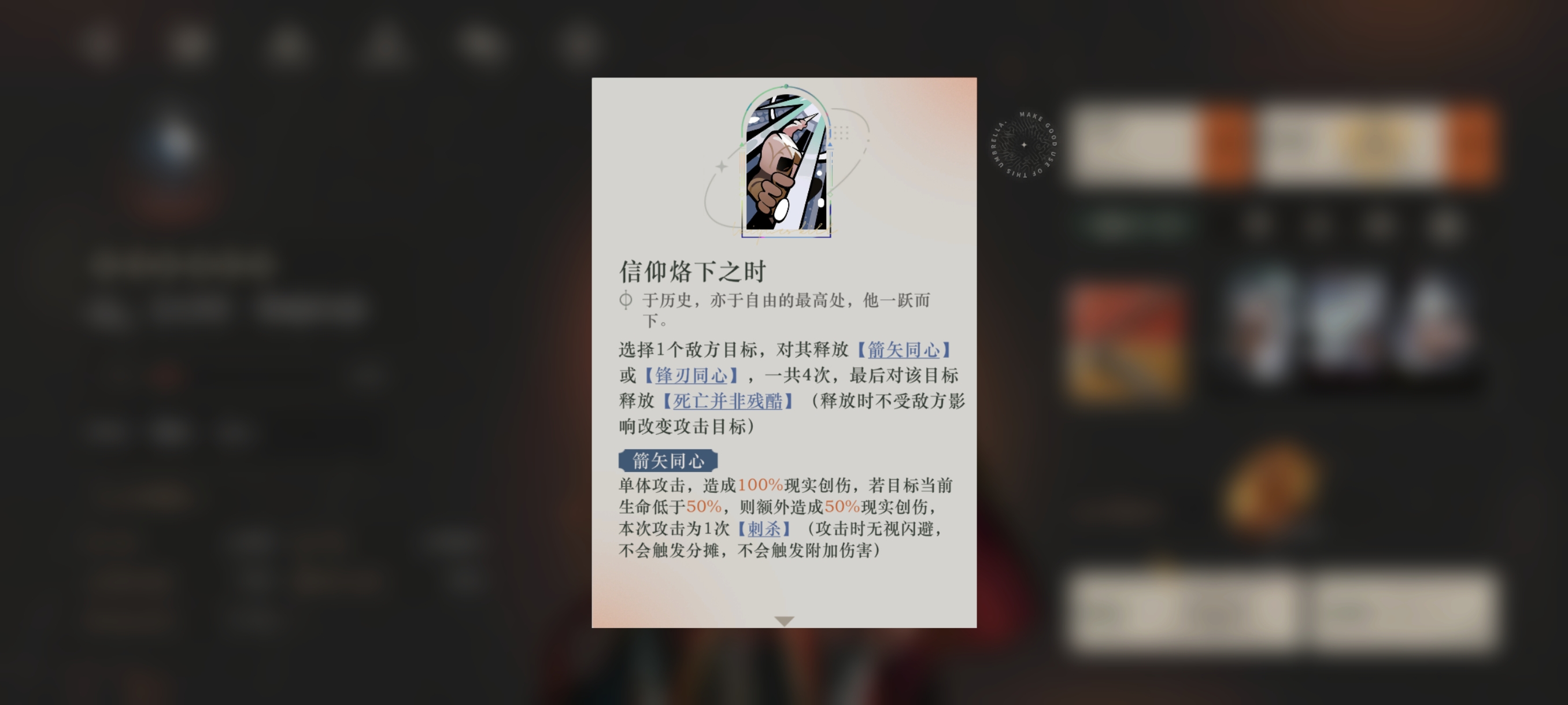 📈 增伤逻辑:基于敌我“技巧差距”提升伤害,每100点技巧差增伤5%(专属心相可提升至7%),属于独立乘区,对低技巧敌人(如噩梦境、迷思海敌人,技巧≤300)收益极高。