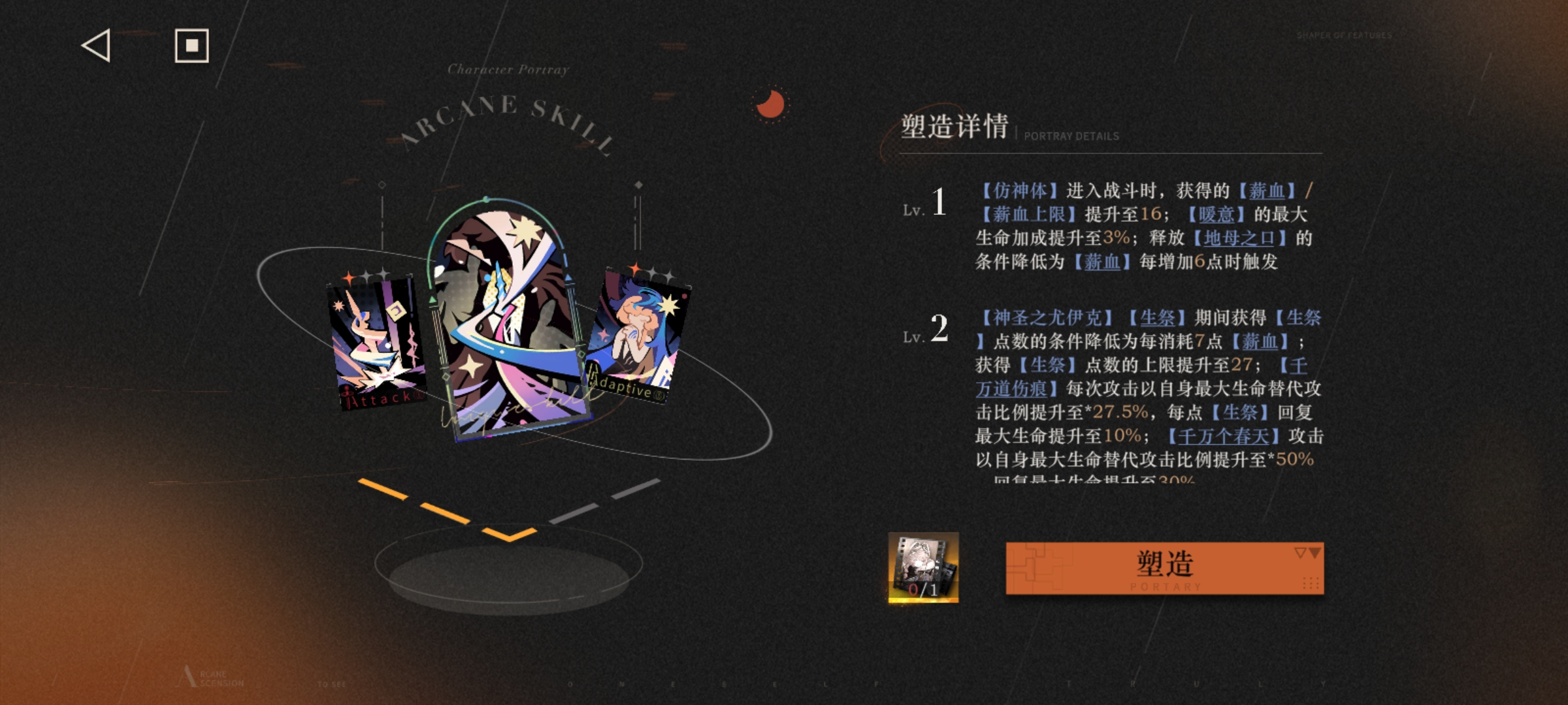 诺谛卡的主要输出方式就是积攒薪血,信仰满之后打出大招,也就是至终仪式。同时高效地攒薪血还能高频地触发地母之口。