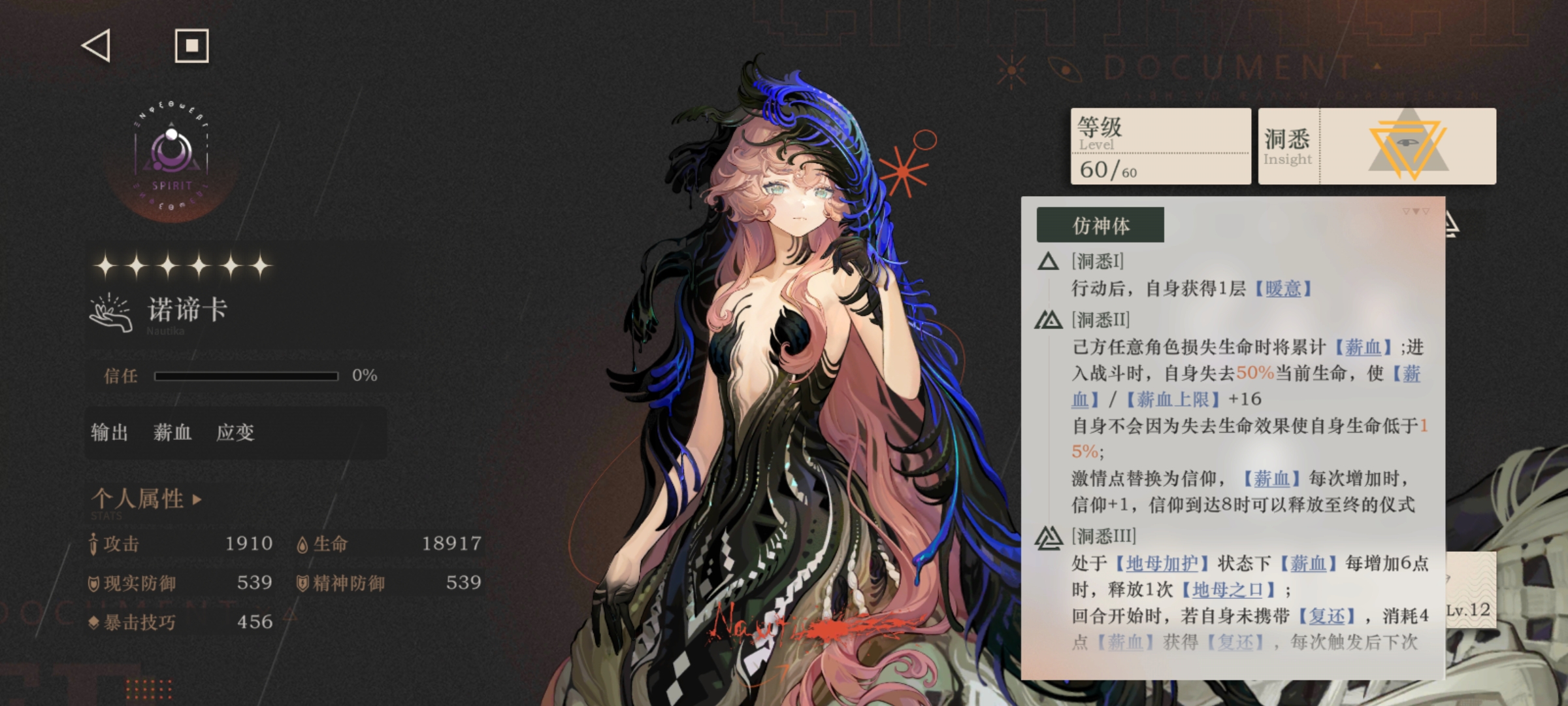 另外还要注意诺谛卡的血量,由于心相效果以及塞梅和温妮的狂想效果,诺谛卡的血量低于一定百分比时可以将伤害最大化,但血量不能压太死以免被敌人攻击打死,死一次会消耗一次复还,然后下回合扣减薪血重新施加复还buff,死越多扣越多,以目前的薪血体系的薪血积攒速度来说,这种扣减惩罚是挺严重的。