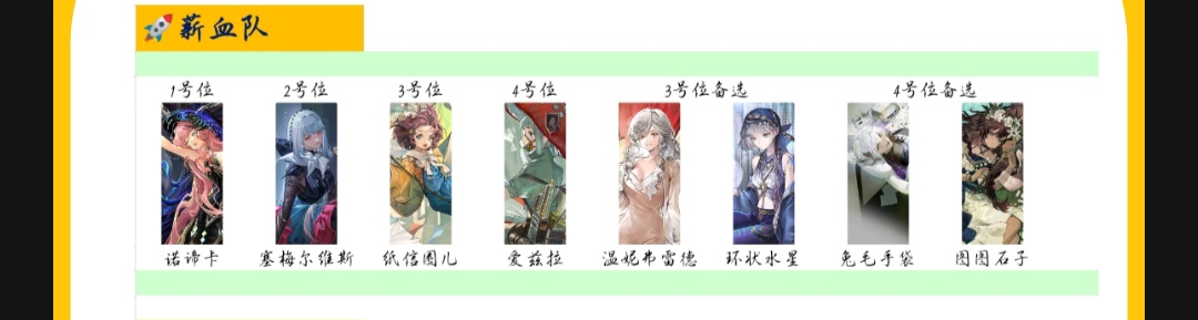 由于目前的薪血体系队友比较少,配合狂想的塞梅尔维斯、温妮弗雷德等队友才能更快地积攒薪血。诺谛卡单走虽然也能积攒薪血,但是积攒速度会有所下降,伤害自然也会下降,推荐至少配一个塞梅。