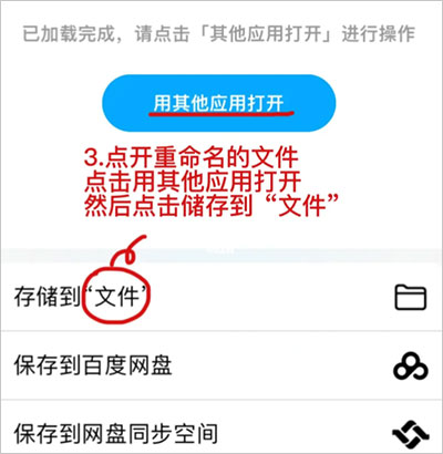 3、点开重命名的文件点击用其他应用打开然后点击储存到“文件”