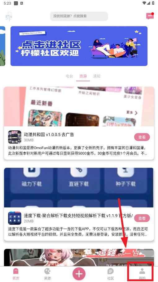 打开漫游社区app,进入首页后,点击右下角我的
