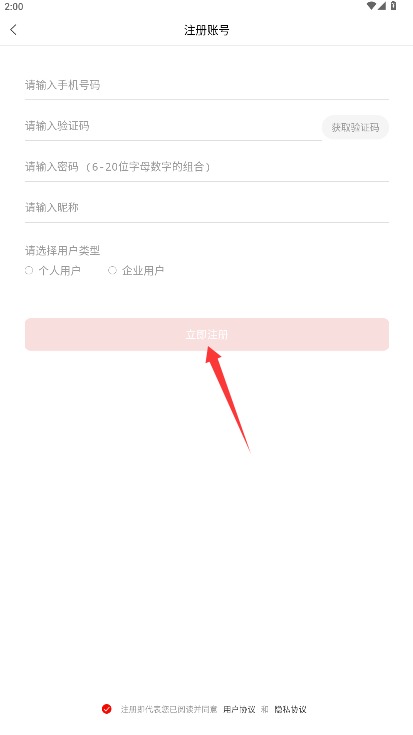 3.准确输入手机号码并获取验证码,设置密码、填写昵称及选择用户类型后完成注册。