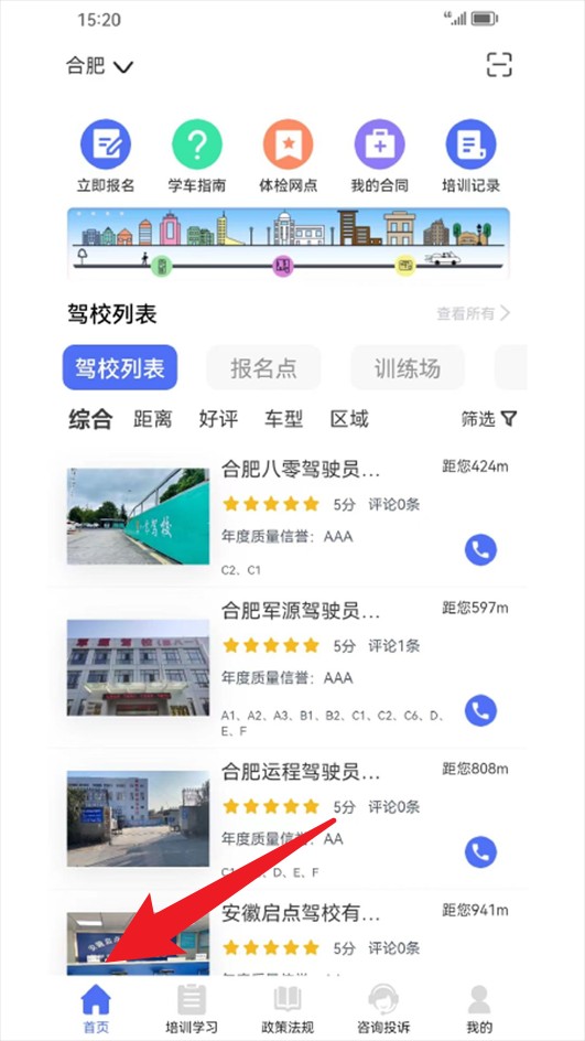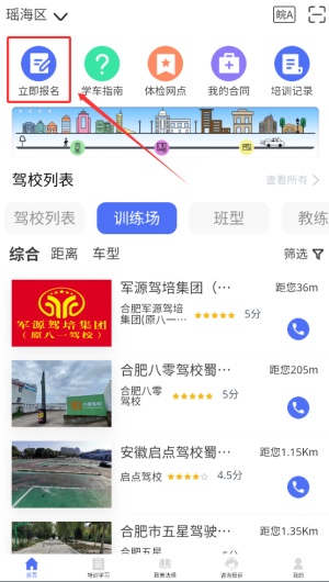 2. 打开首页可浏览附近駕訓班列表,支援按距离、评价等维度筛选,并可一键进入查看駕訓班详情。