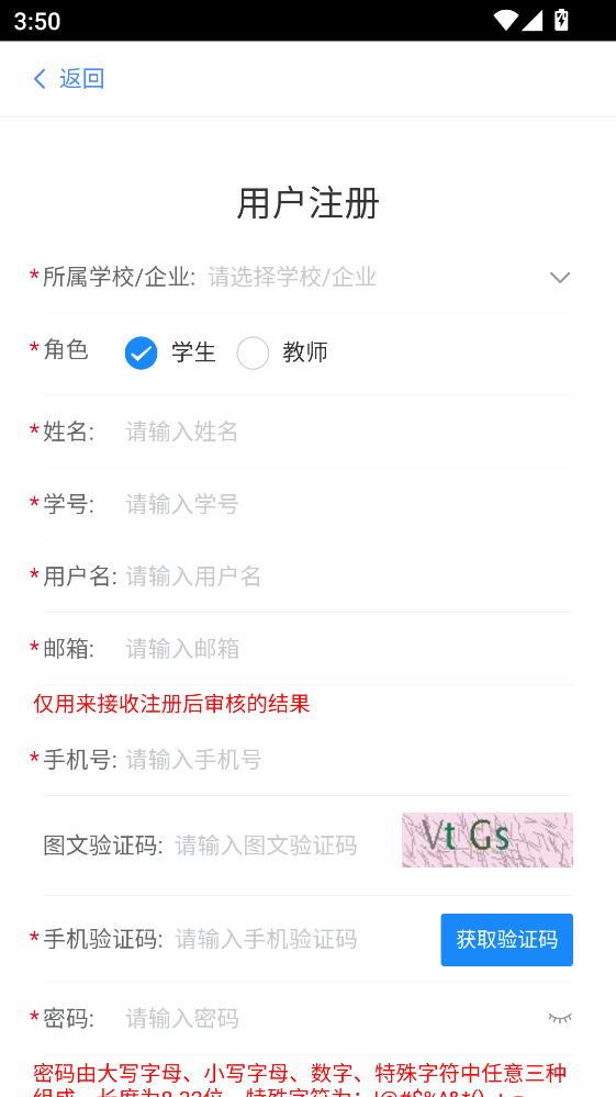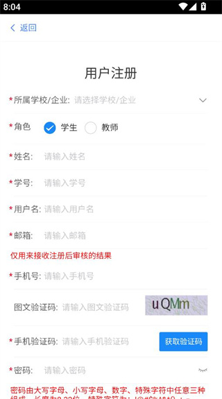 3.没有账户的小伙伴们,可以点击立即注册,选择学生或者老师的角色,填写基本信息和手机号注册。