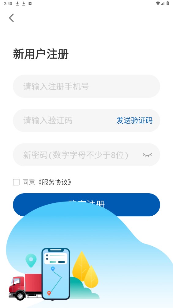 输入手机号,发送验证码,自定义密码,点击确定注册按钮。即可完成注册,返回登录即可。