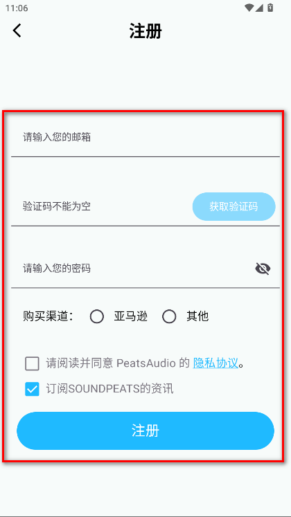 3、填写邮箱,验证码,密码,勾选相关协议,点击注册