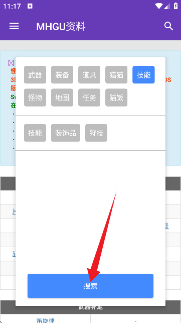 4、然后点击左上角的【三】按钮可以在这里切换频道,如【武器,装备,道具,猎猫,技能,怪物,地图等】。