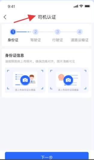 2、司机实名认证分四步进行,需上传身份证、驾驶证、行驶证和道路运输证照片。