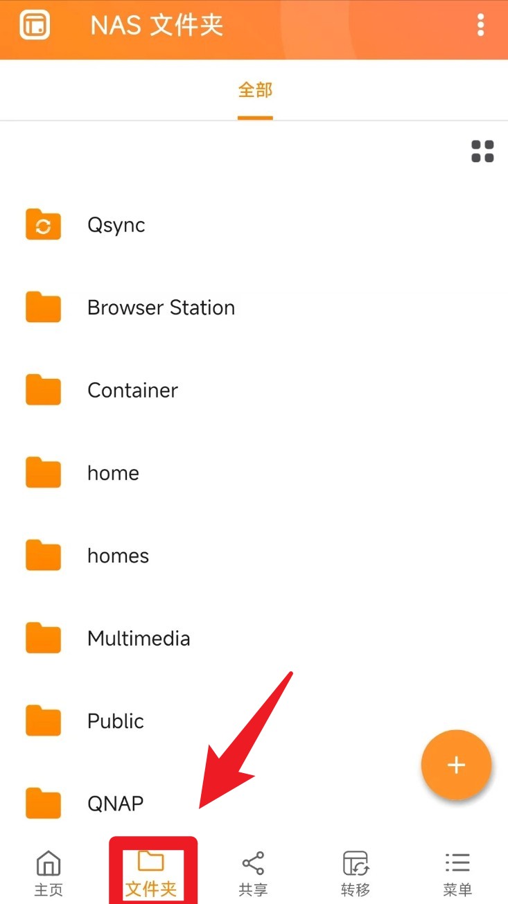 3. 画面下方点击「文件夹」选项,即可进入 NAS 文件夹浏览区,依照资料夹分类浏览 QNAP 设备内的所有档案内容。