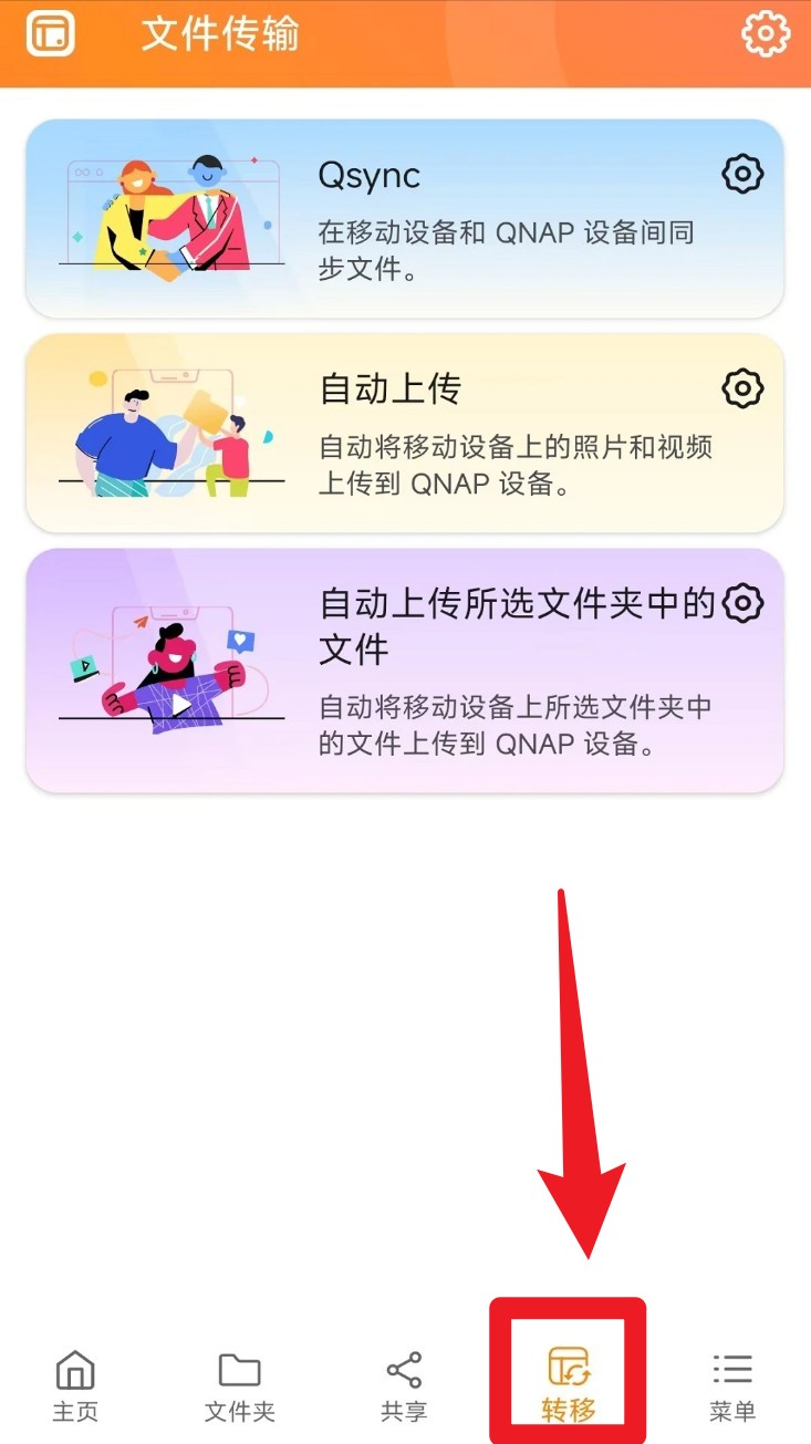 4. 点选底部的「转移」,可开启文件传输功能,依需求选择 Qsync、自动上传照片,或指定文件夹进行同步传输。